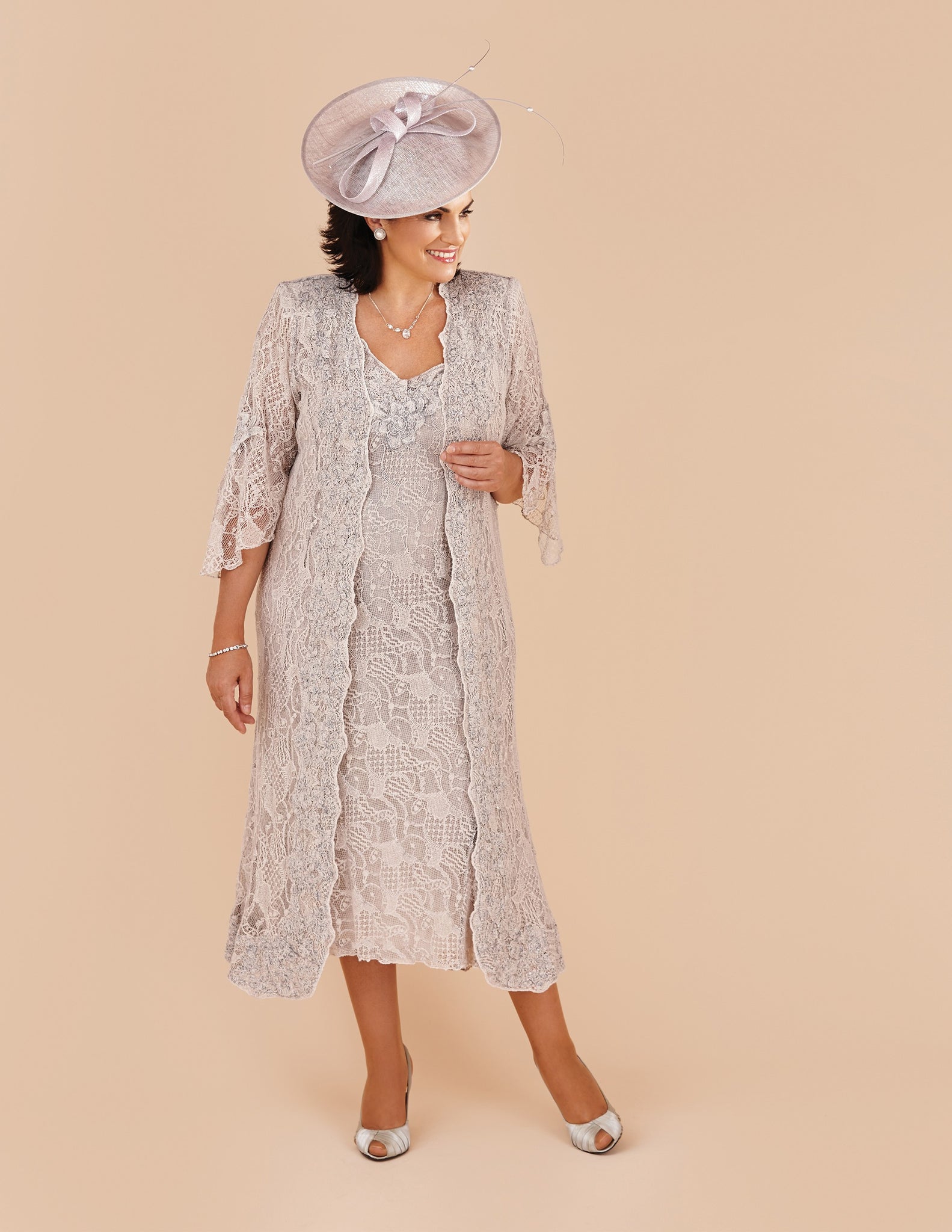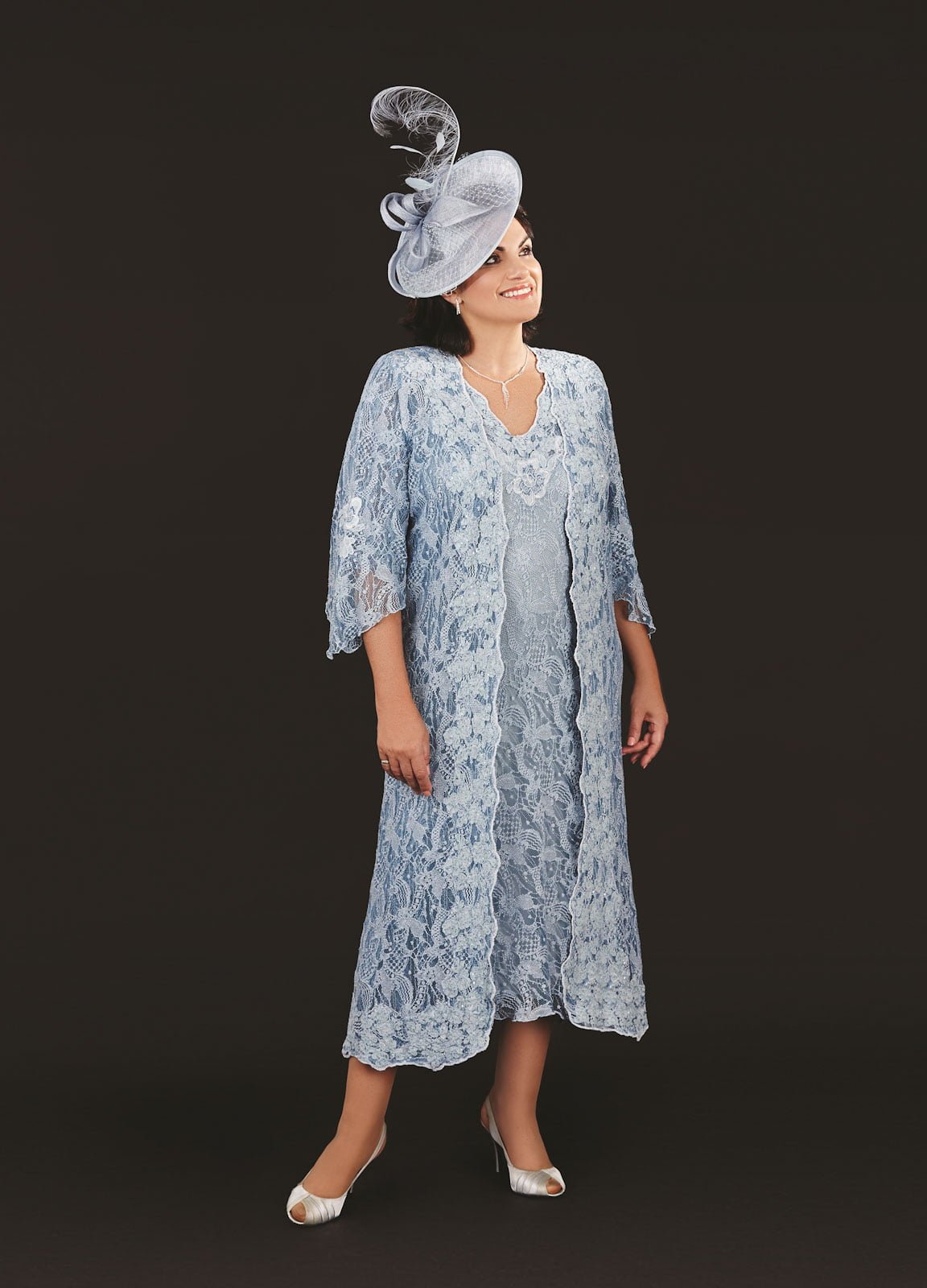 A fully lined fine lace dress with a softly scooped neckline and extra wide attractive straps. The neck and straps are delicately appliqued and scattered with sequins. The matching coat has scalloped fronts with the same delicate applique and embossed semi-slit dainty elbow-length sleeves.