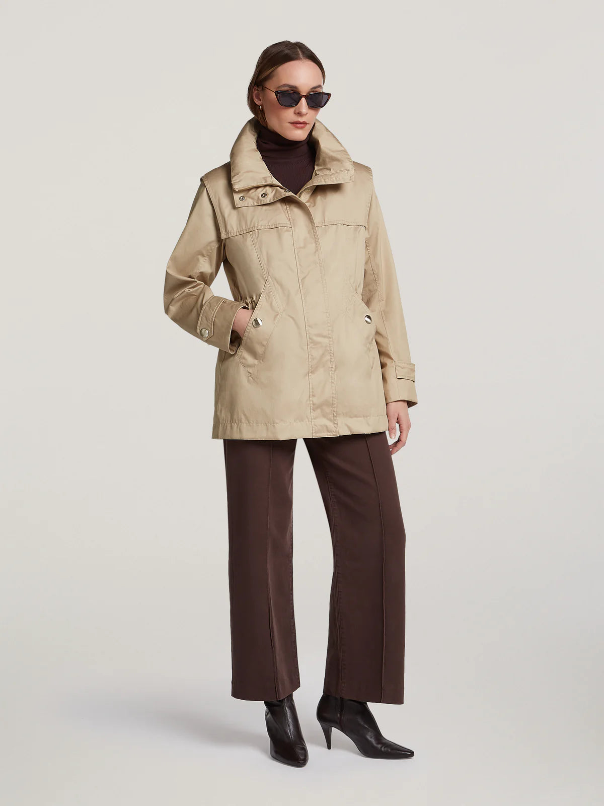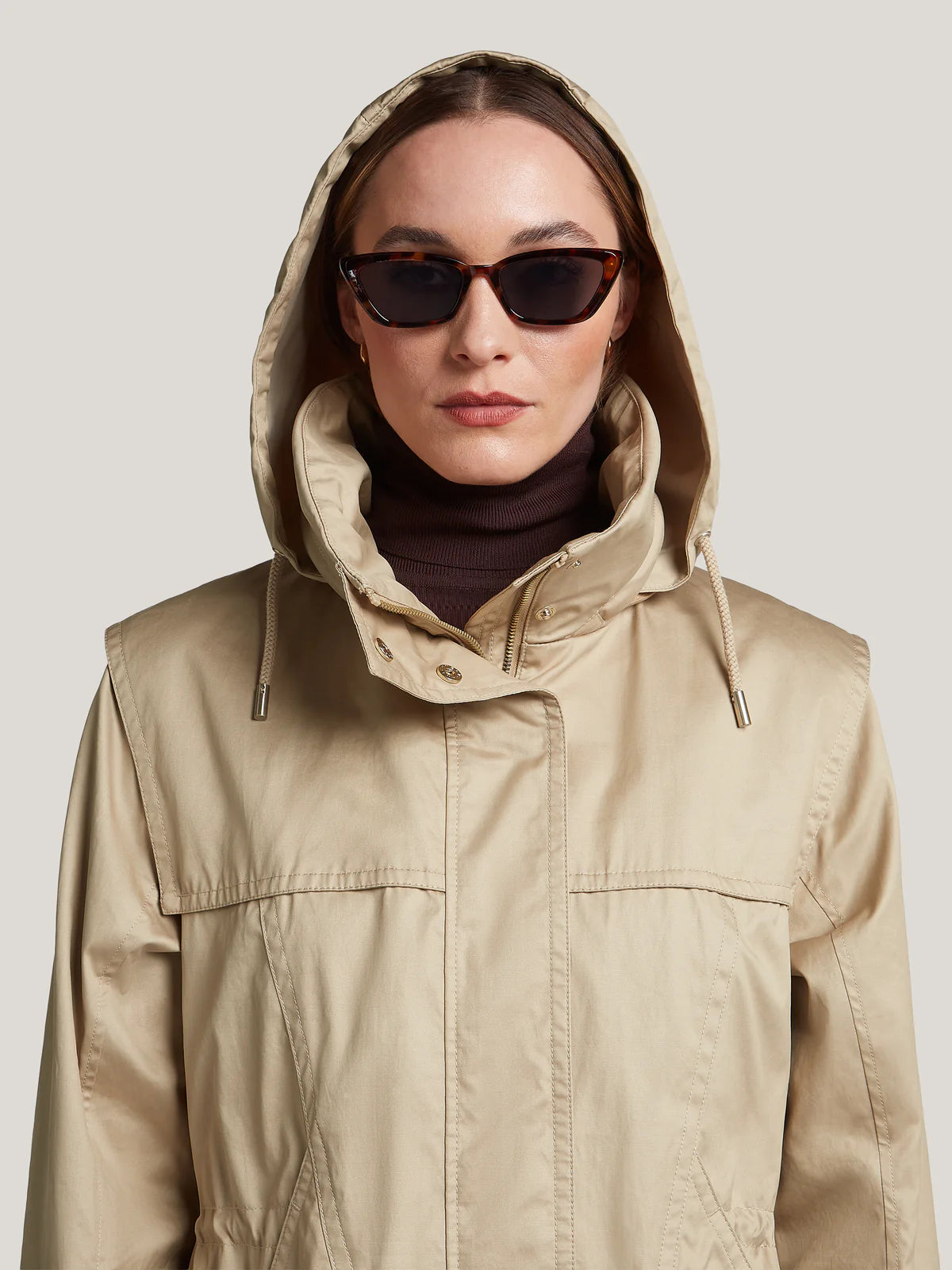 This jacket is made from luxurious water resistant shiny cotton, combining style with comfort. Barn jacket shoulder flaps with press buttons and a hood that folds into the collar add functional, unique details. A waist tunnel with cord allows for a customizable fit, while the front placket with hidden press buttons keeps the look sleek. With its distinctive design, it’s a versatile piece that elevates any outfit.