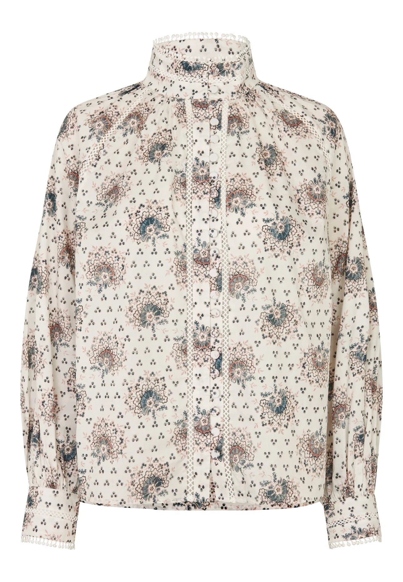 Delicate lace trim runs around the stand collar and cuffs and along the front placket and shoulder seams of this feminine and chic blouse. The cotton voile fabric printed with tiny bouquets of flowers adds to its charm.