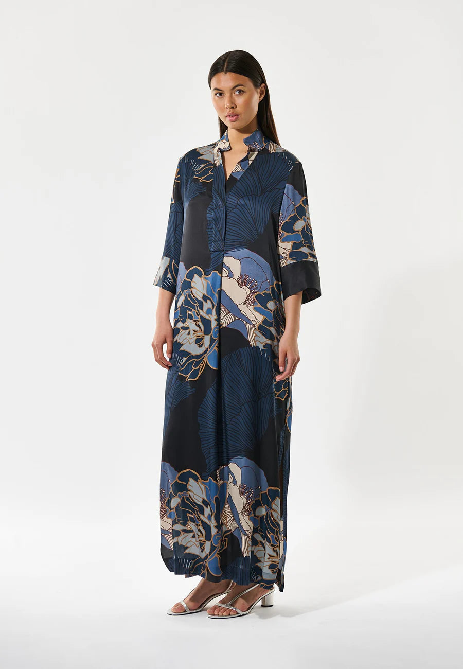 With its relaxed fit and midi length, this shirt dress is the ultimate in easy but stylish wearability. The silk fabric is in a subtle floral print of soft shades and the dress has 3/4 length sleeves, a simple shirt collar and a placket down the front.