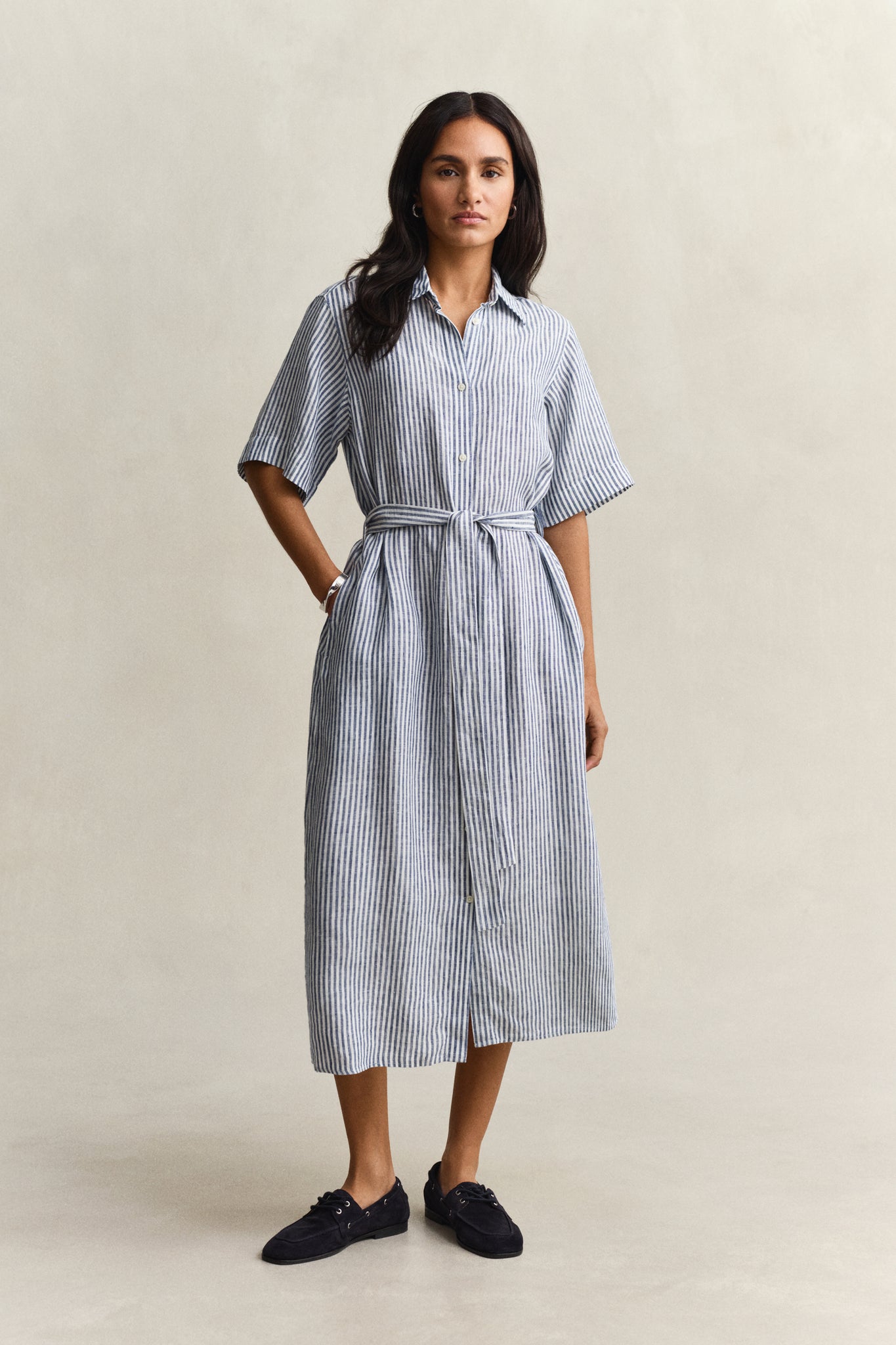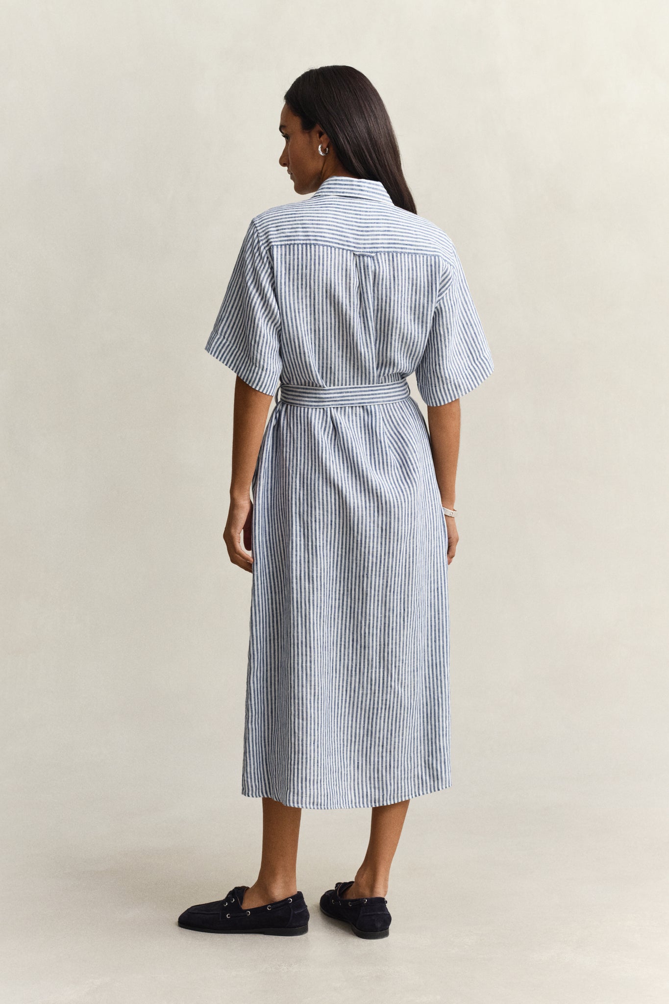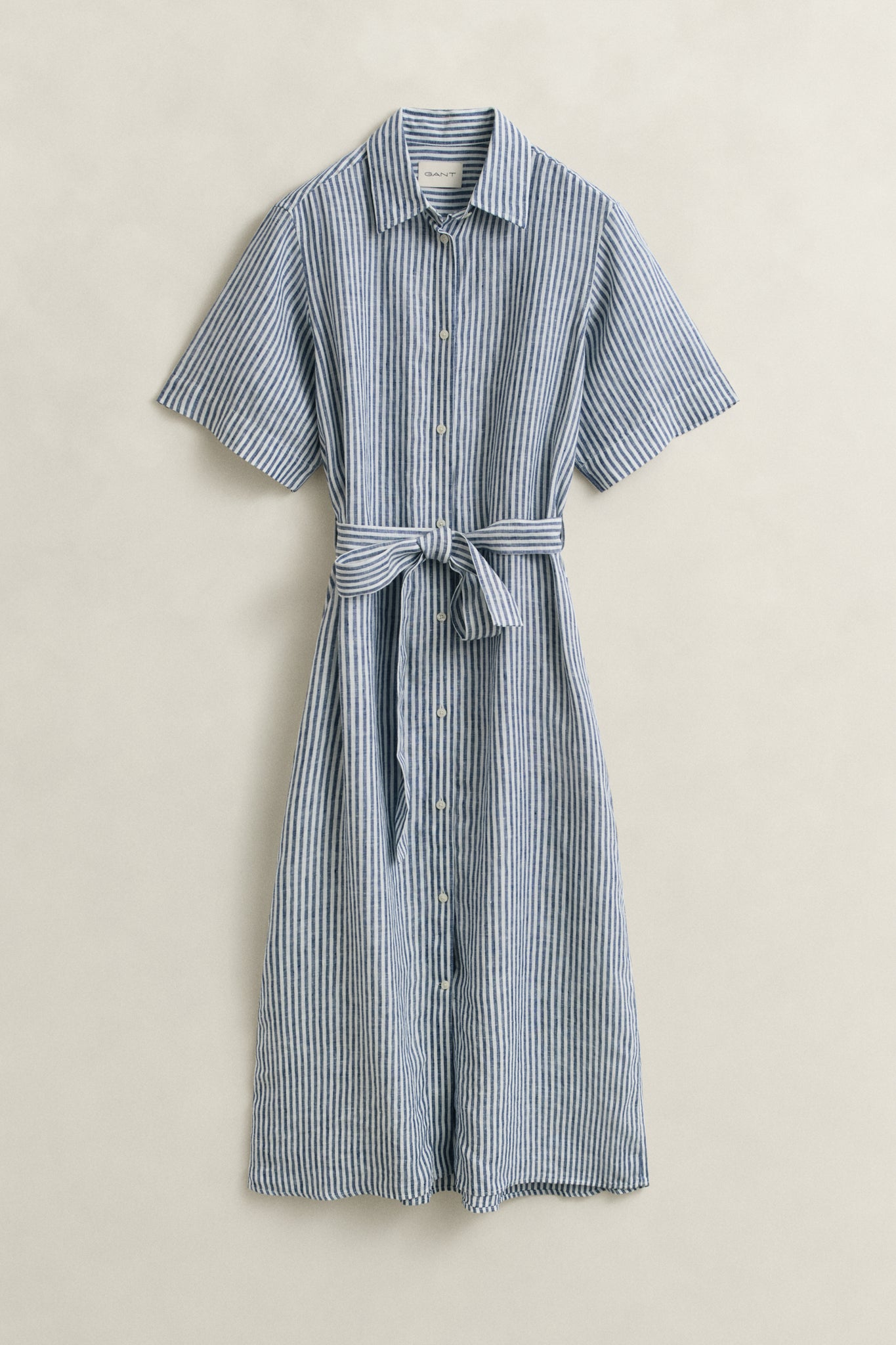 Crafted from certified European flax linen for natural breathability and lightness, this striped dress offers effortless sophistication. Designed in a regular fit with a mid-calf length, it takes inspiration from classic shirting with a point collar and short sleeves. A self-tie belt cinches the waist for a defined silhouette, while practical details include side seam pockets and a full French placket. At the back, a box pleat and Gant's signature locker loop add a refined finishing touch.