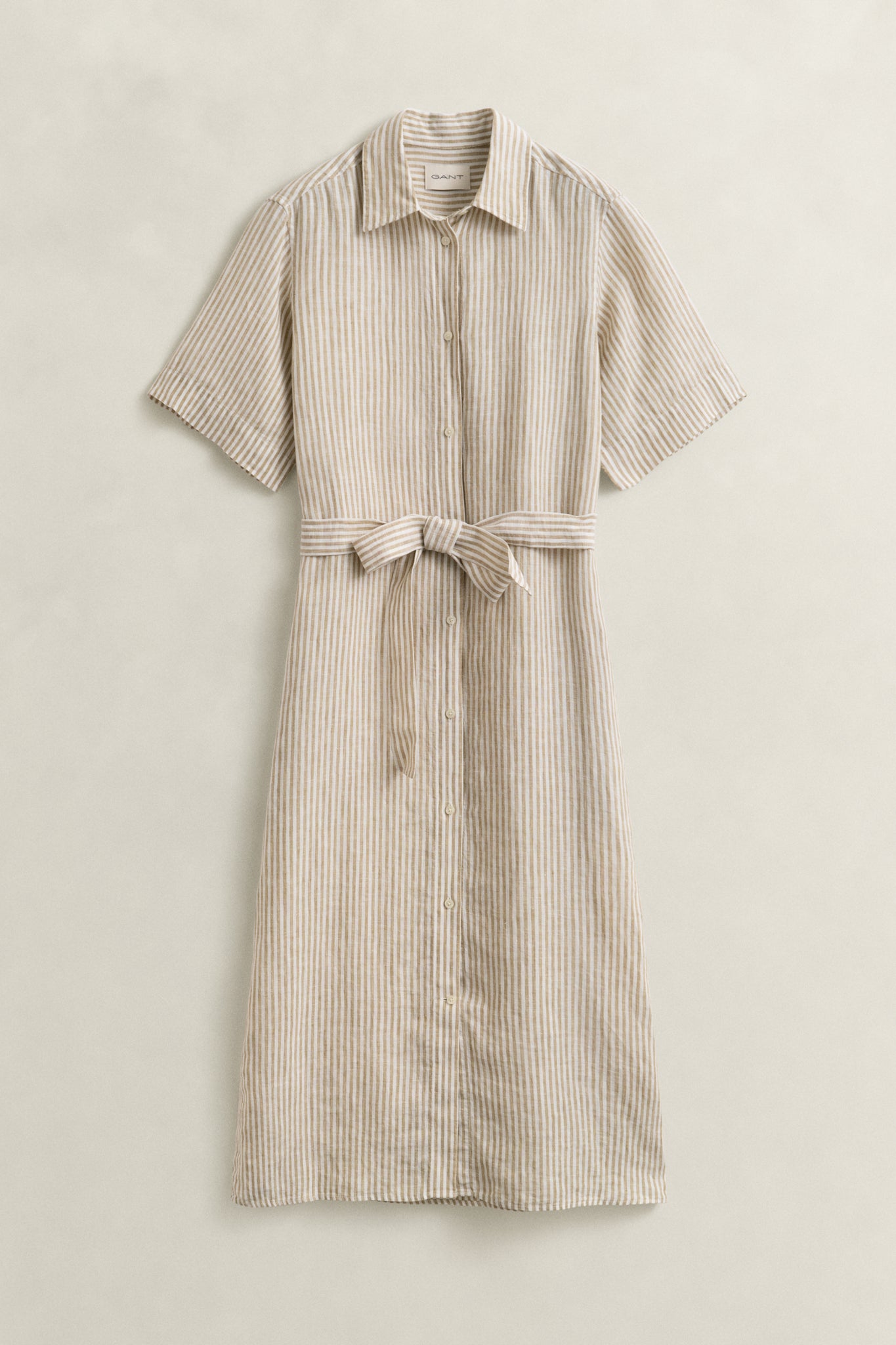 Crafted from certified European flax linen for natural breathability and lightness, this striped dress offers effortless sophistication. Designed in a regular fit with a mid-calf length, it takes inspiration from classic shirting with a point collar and short sleeves. A self-tie belt cinches the waist for a defined silhouette, while practical details include side seam pockets and a full French placket. At the back, a box pleat and Gant's signature locker loop add a refined finishing touch.