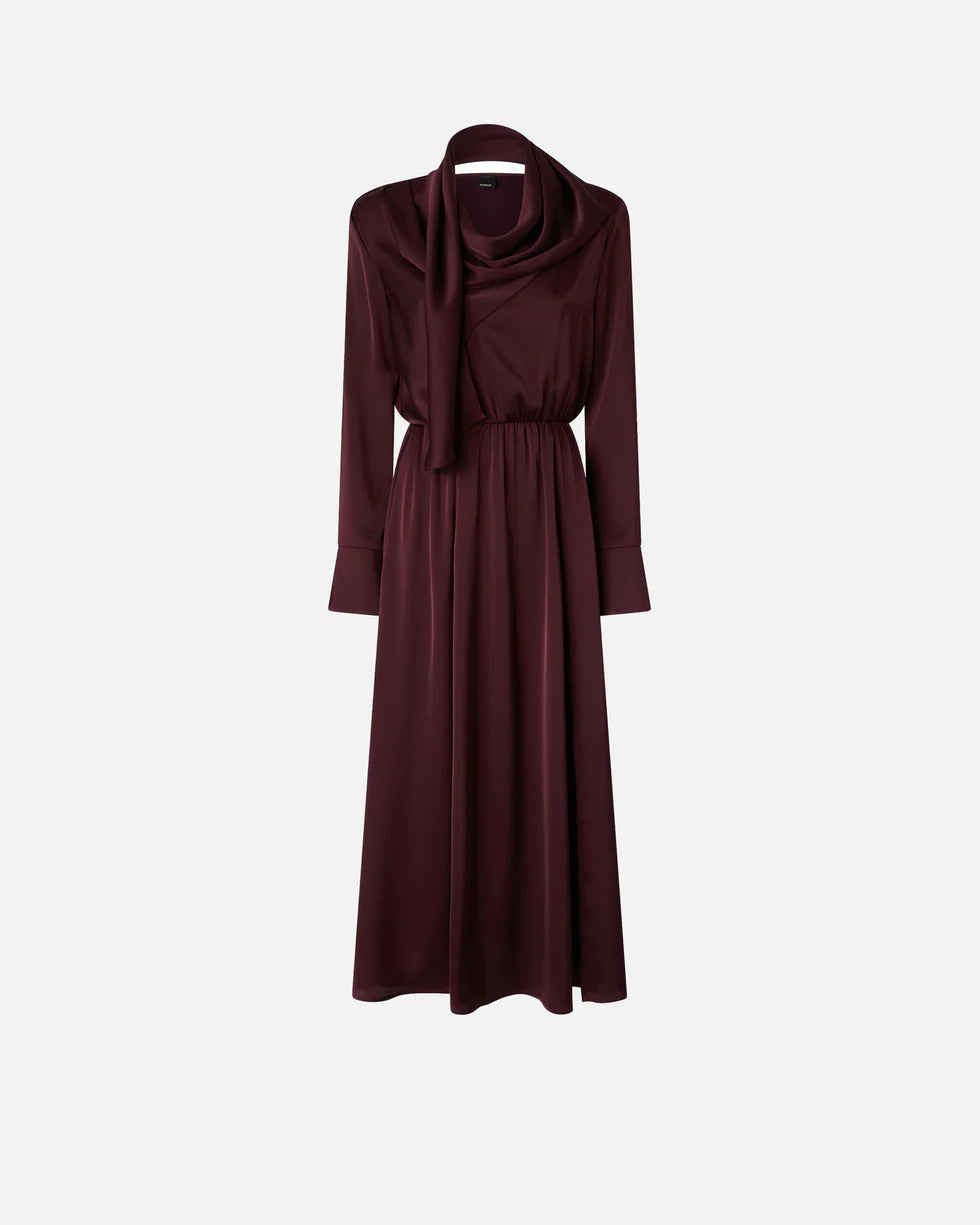 Relaxed-fit dress in satin crepe fabric with elasticated waist and side slit. This garment features long sleeves with flared cuff, a wide skirt and a neck sash that you can wear in different ways for an original, personal look with that pure PINKO style. Choose this piece for a fluid, slinky effect that brings out the female figure in an elegant, refined way.