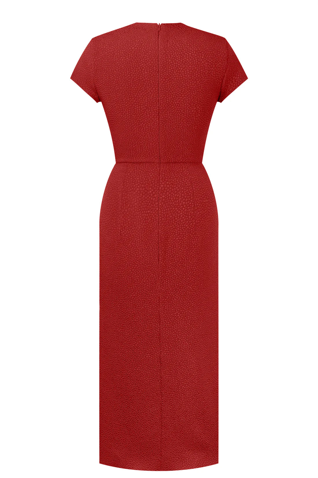 The Tati Dress is has a tailored V-neck bodice and cap sleeves. The slim skirt features an asymmetrical split drape at the front.