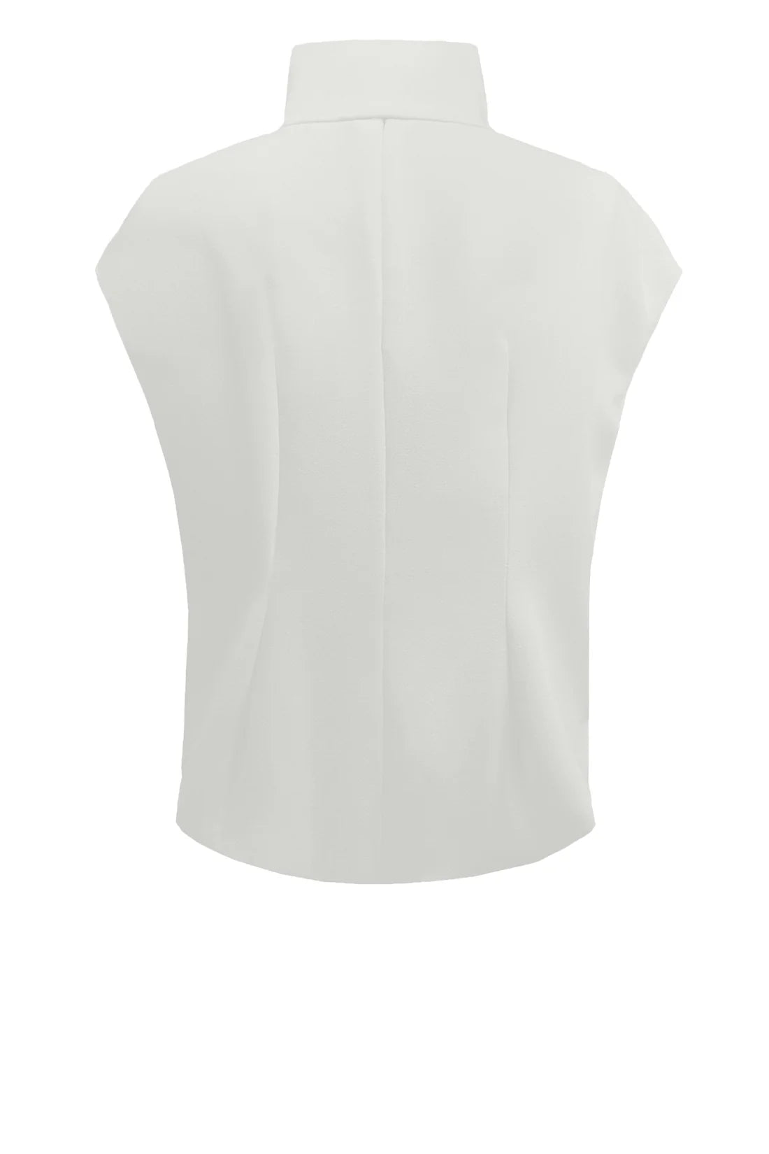 The Tulip Blouse has a slightly oversized fit and features a draped tulip turtleneck. The blouse has delicate dart details at the shoulder and waistline and armholes that drape into a slightly capped sleeve.
