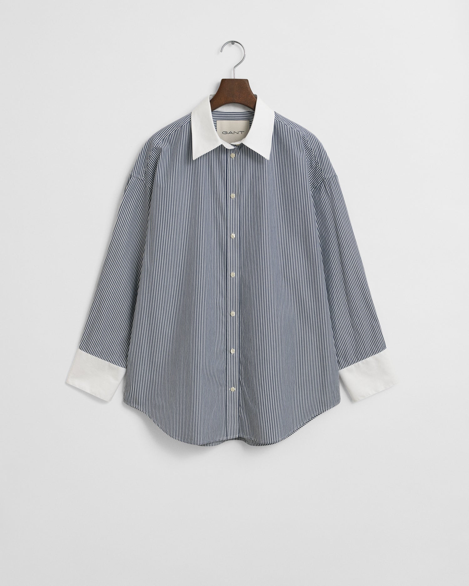 The oversized shirt, made from certified cotton, showcases yarn-dyed stripes. It includes a point collar, curved hem, recycled polyester buttons, and a box pleat with a signature locker loop at the back. The shirt is highlighted by a contrast collar and cuffs, along with a tonal GANT logo embroidered on the sleeve placket. This shirt is designed for an oversized fit, but if you prefer a closer fit, we suggest sizing down.