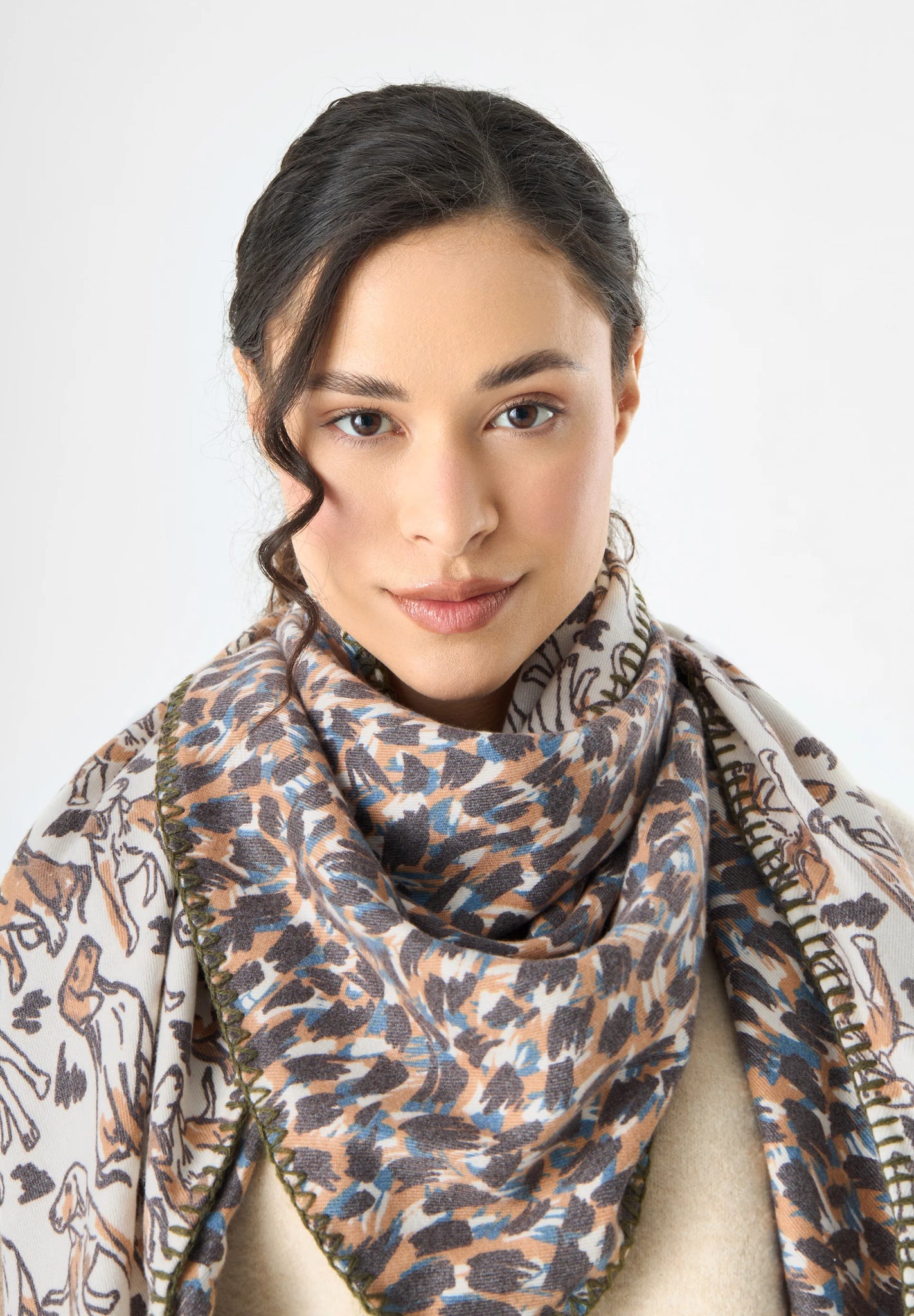 An eye-catcher for every day: This cashmere-soft triangular scarf in beige tones impresses with an extraordinary mix of leopard print and playful dog motifs. The pleasantly soft material blend nestles gently against the skin and provides warmth in winter.