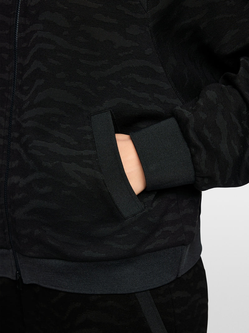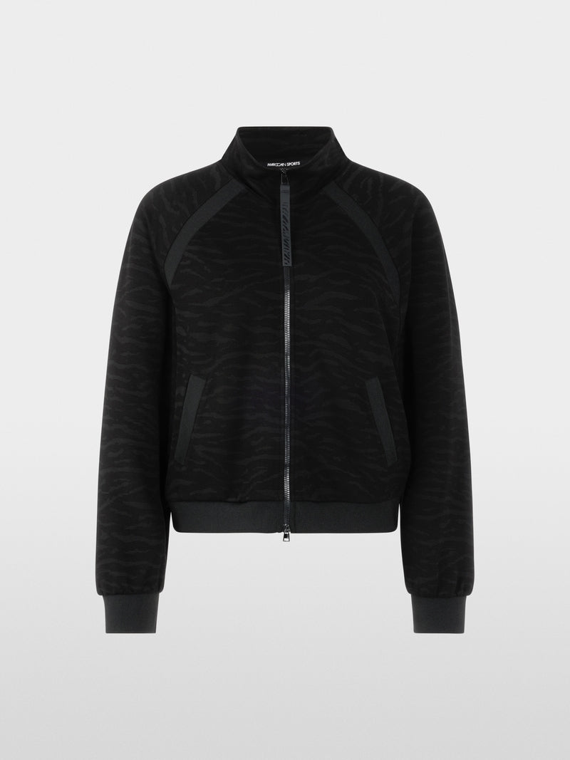 Lightweight blouson-style jacket made from fine material with a modern animal print. This jacket impresses with its wide, loose fit and stand-up collar. A zip and knitted cuffs add to the sporty look. The side pockets are a practical addition.