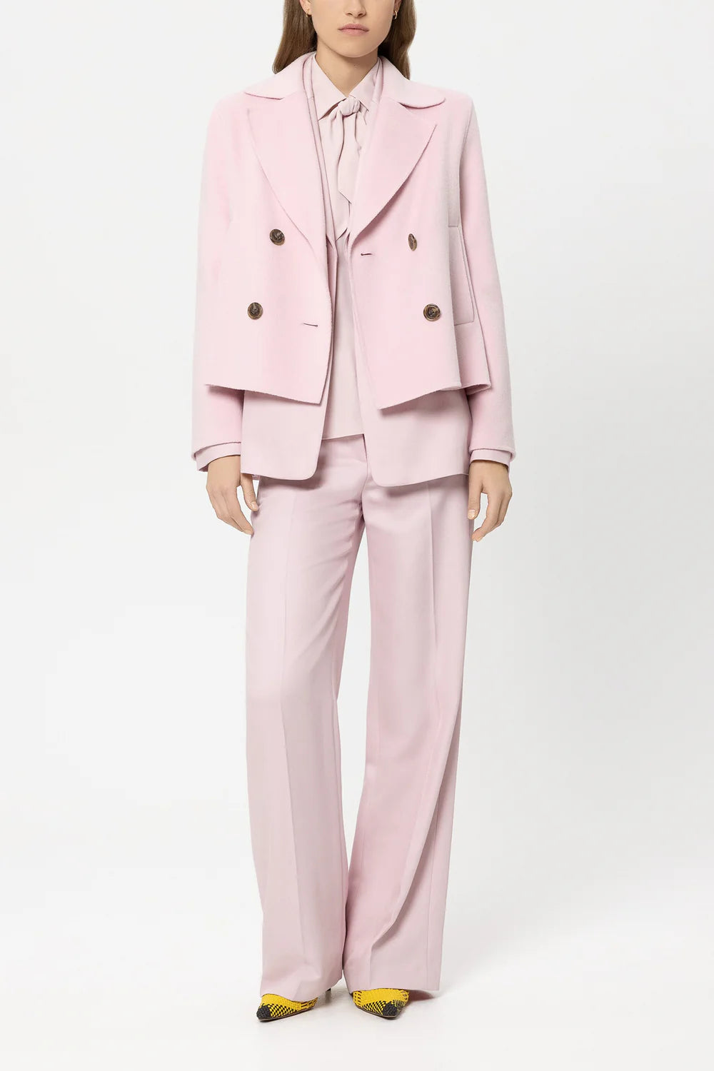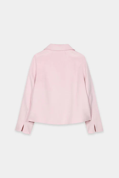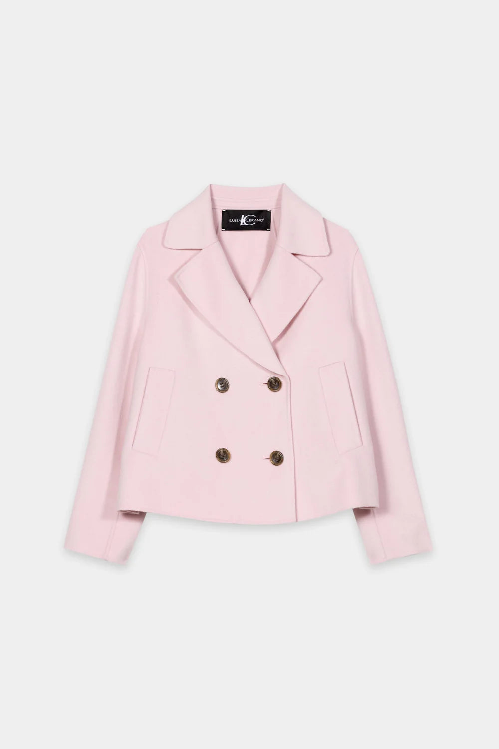 Cropped caban jacket made from a luxurious wool and cashmere blend with a sophisticated, handmade double-faced finish. The double-breasted buttoned jacket has a classic lapel collar and two side pockets.
