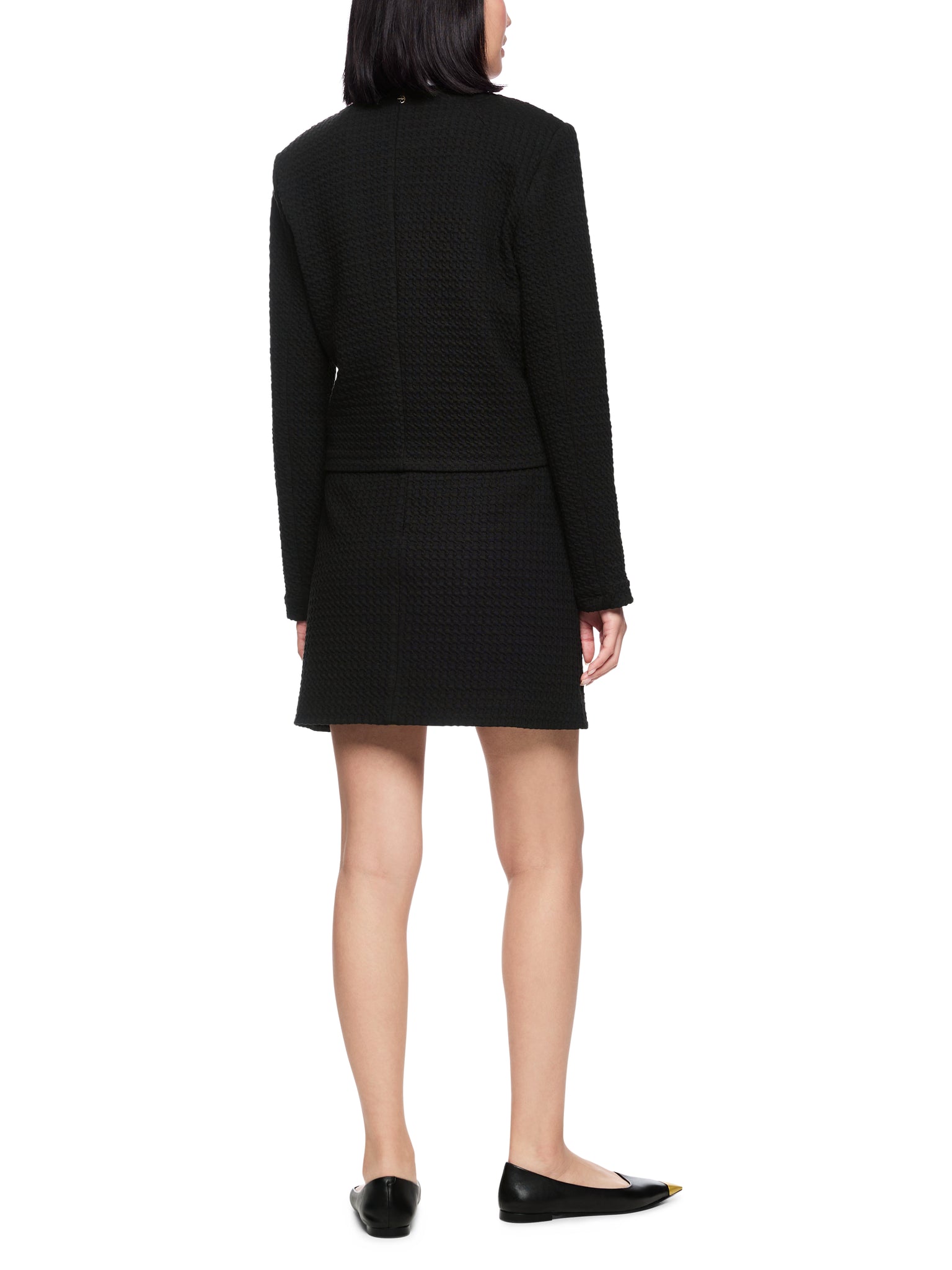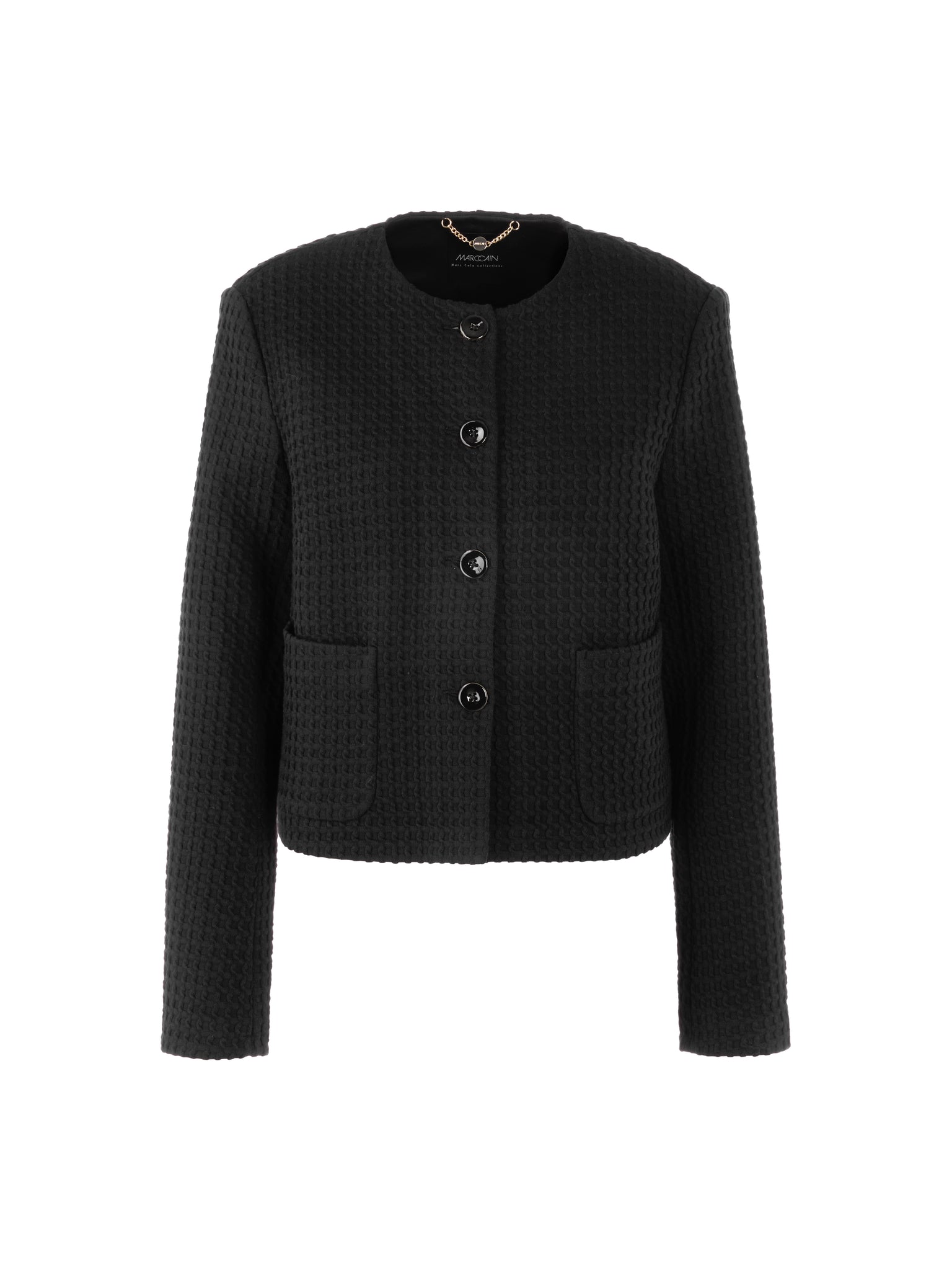 With its textured waffle piqué, this jacket is made from a high-quality cotton blend. It fastens with a classic row of buttons, and two patch pockets offer practical details. The light weave texture gives this jacket an elegant appearance and ensures a modern, stylish look – ideal for the office and leisure. The matching skirt is available separately.