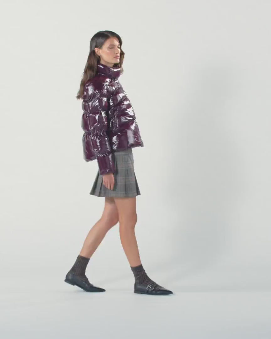 Padded pea coat in crystal-effect nylon fabric with a special glossy finish, customised with the Love Birds logo patch on one sleeve. This style features horizontal quilting, which is slightly slanted on the front, and has a wraparound high collar with hidden buttons to protect you from the cold. Two-way metal zip fastening at the front. Product No: 101597-A2P7/D93