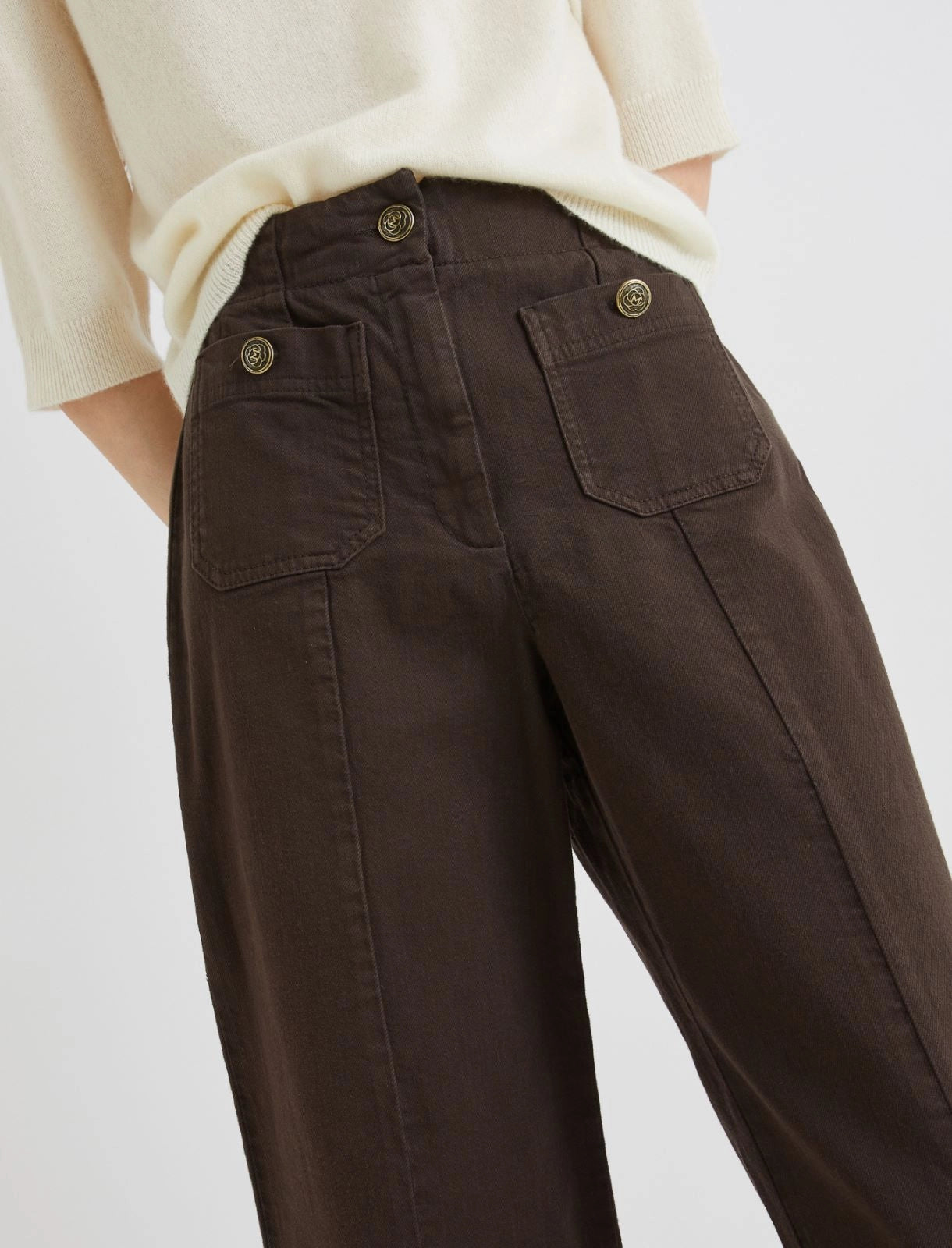 The high waist and wide leg are the perfect ingredients for an ultra-feminine silhouette. The ‘70s-inspired front pockets feature small buttons and pressed pleats.