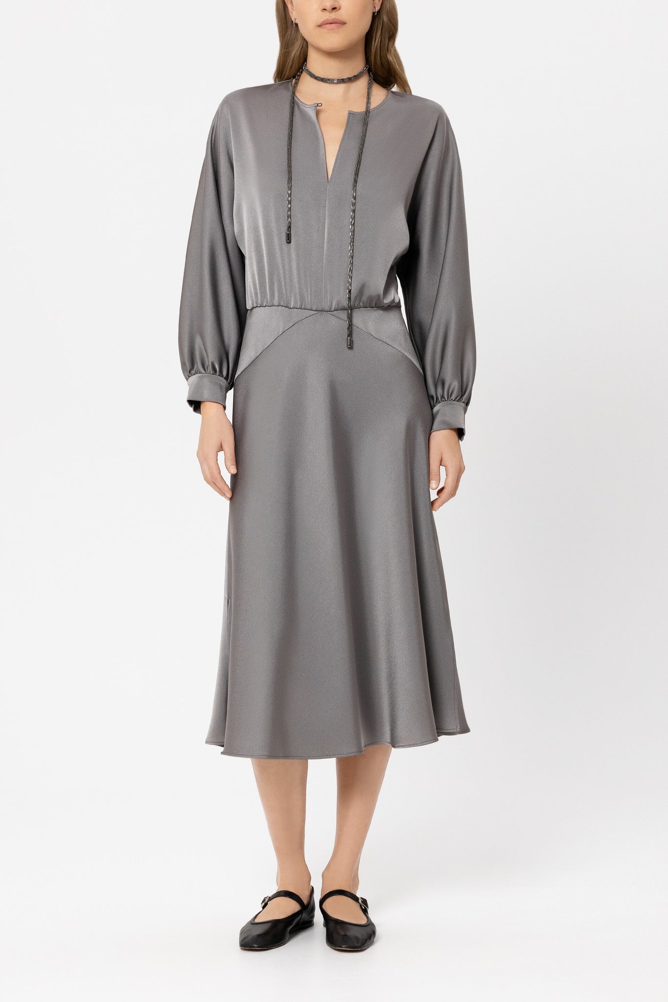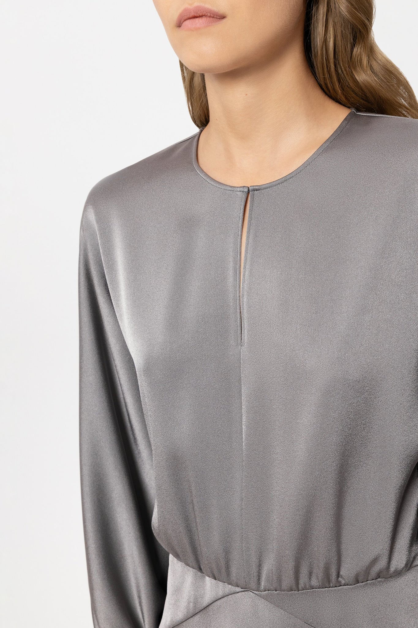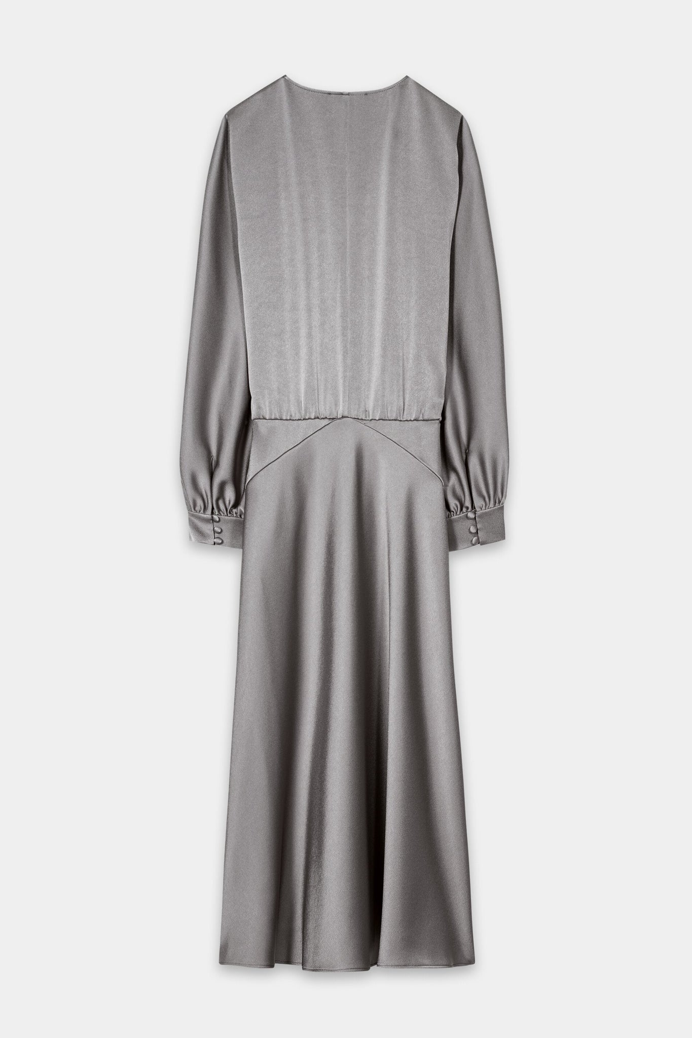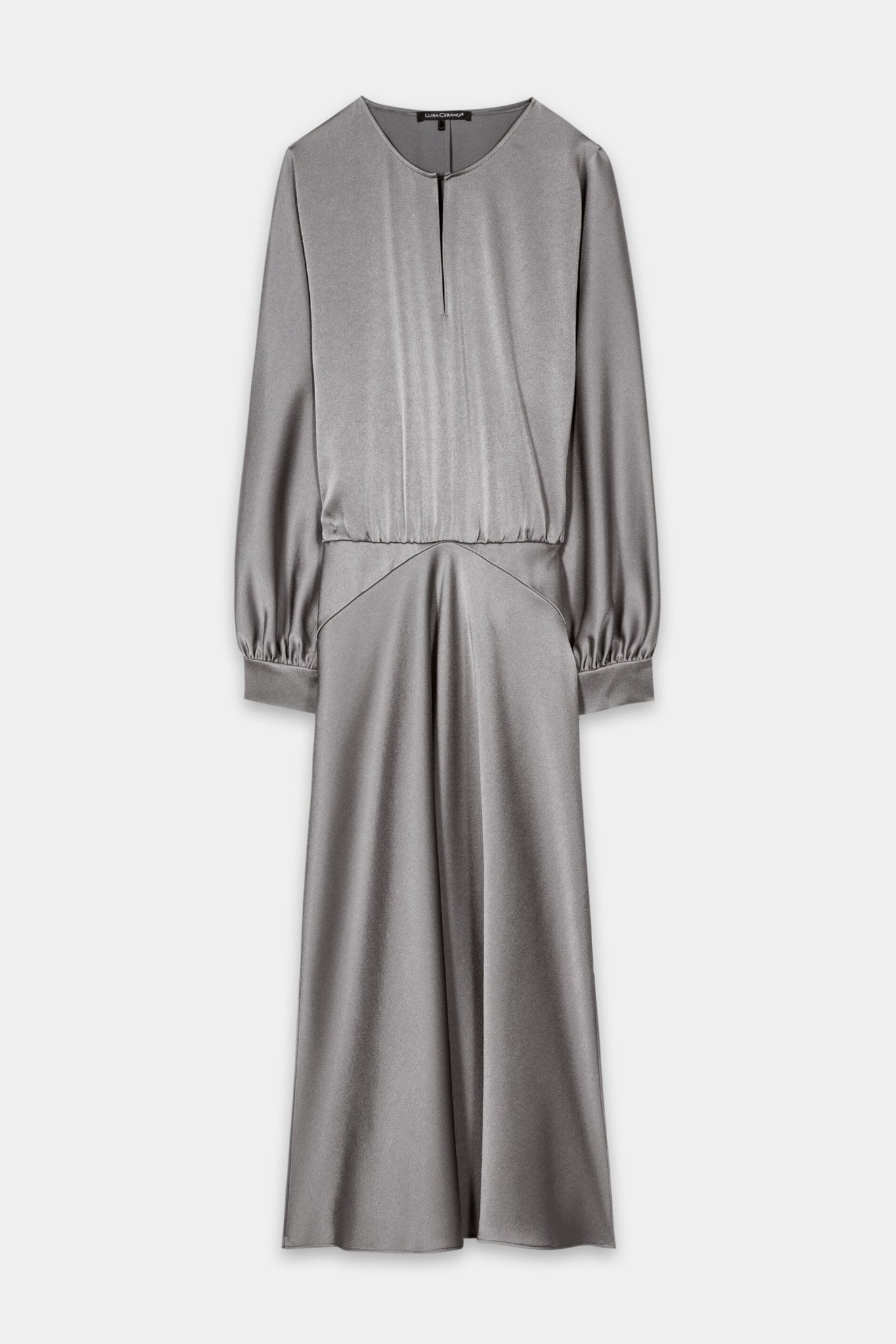 Long sleeve maxi dress made from heavyweight techno silk with a beautiful shiny look. The front features a cut-out and a slightly flared skirt.