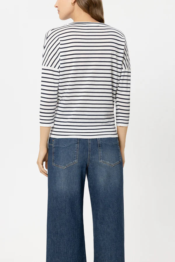 Striped cotton blend shirt with a bateau neckline, soft neck tape and subtle logo embroidery. The hem and three-quarter sleeves are finished with a ribbed cuff.