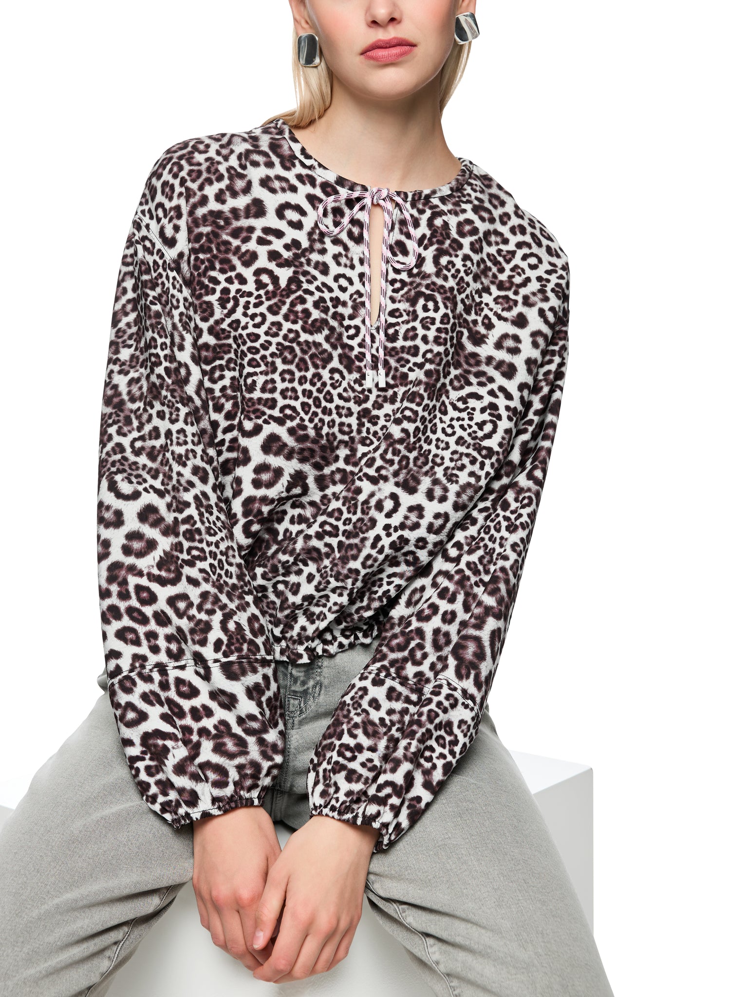 Loose-fitting blouse with a modern leopard print. This blouse impresses with its wide cut and slightly cropped shape, making it a stylish companion for any occasion. It features elasticated inserts at the hem, allowing you to adjust the width to suit your individual needs. Another detail is the V-neck with drawstring, which gives the blouse a sporty touch. The airy, loose viscose blend is pleasantly soft against the skin