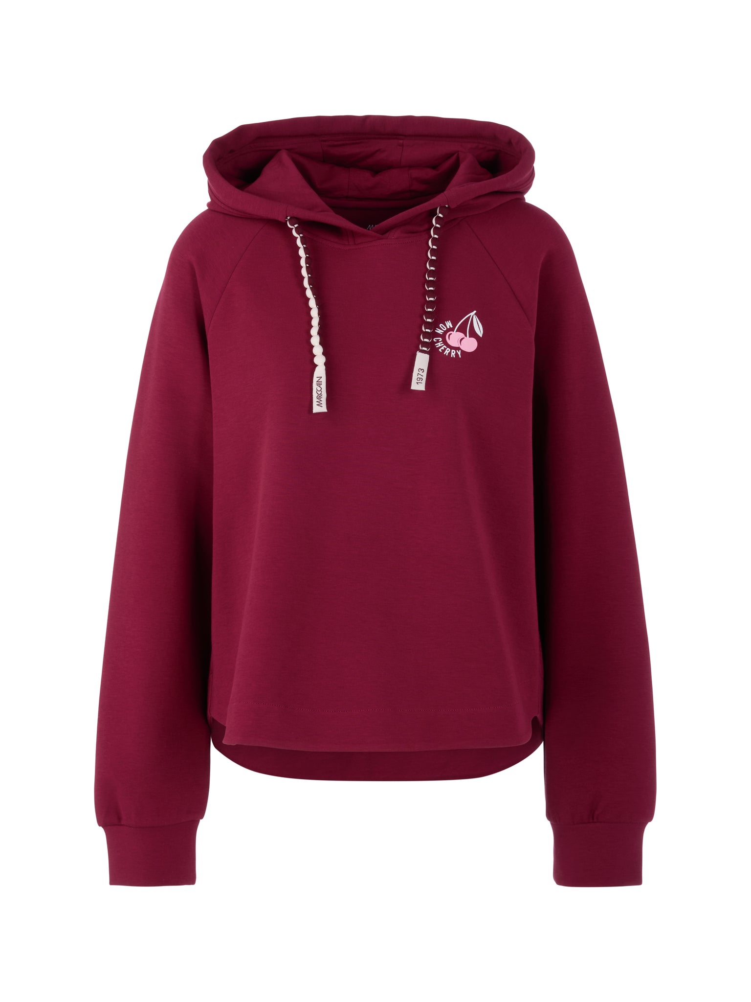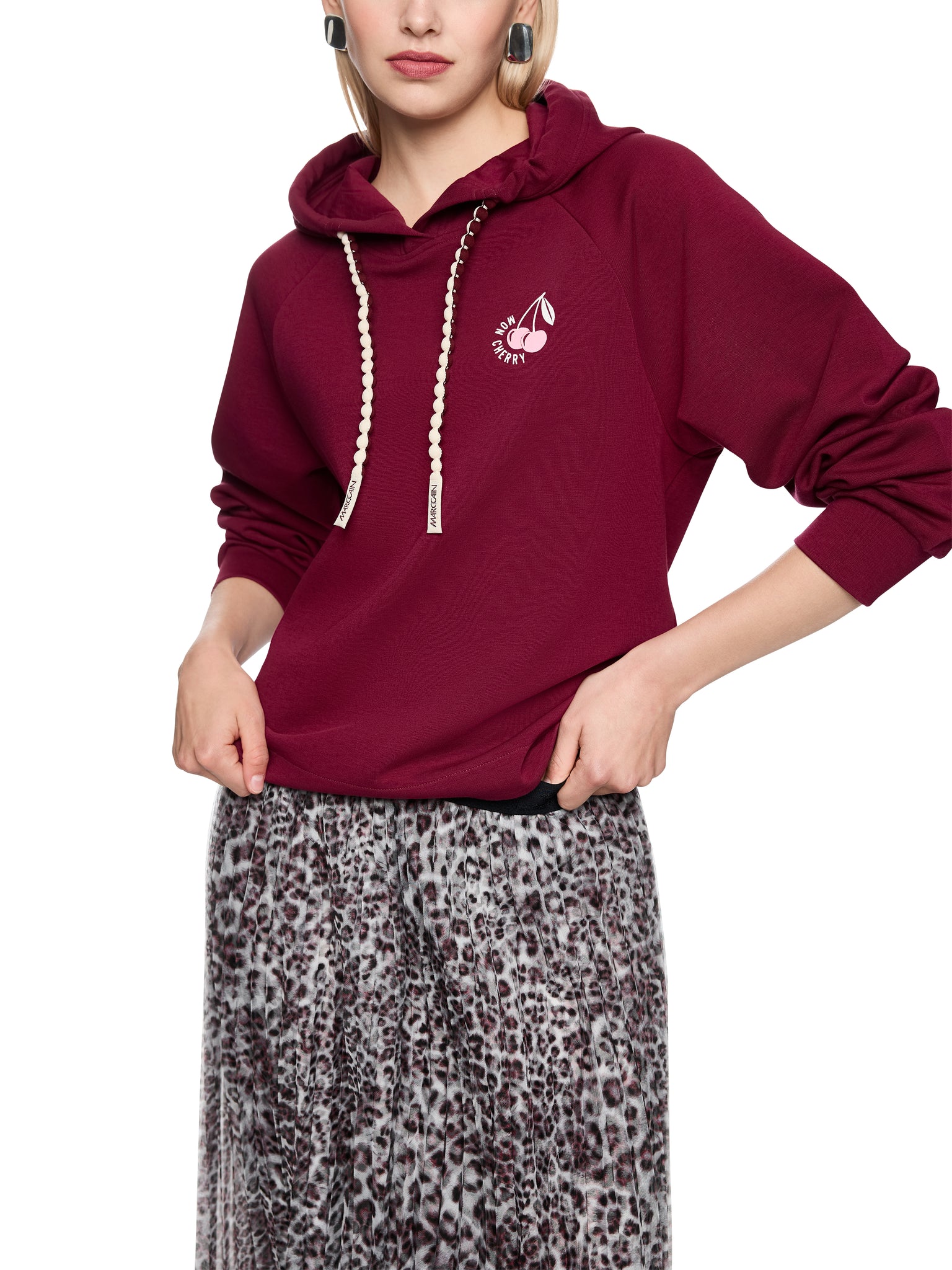 Casual hoodie with a relaxed fit and modern print. The sweatshirt comes with a practical hood, raglan sleeves and a slightly rounded hem. The cherry print is small on the front and large on the back and features rhinestones. Another detail is the drawstring, which is two-tone and round in shape.