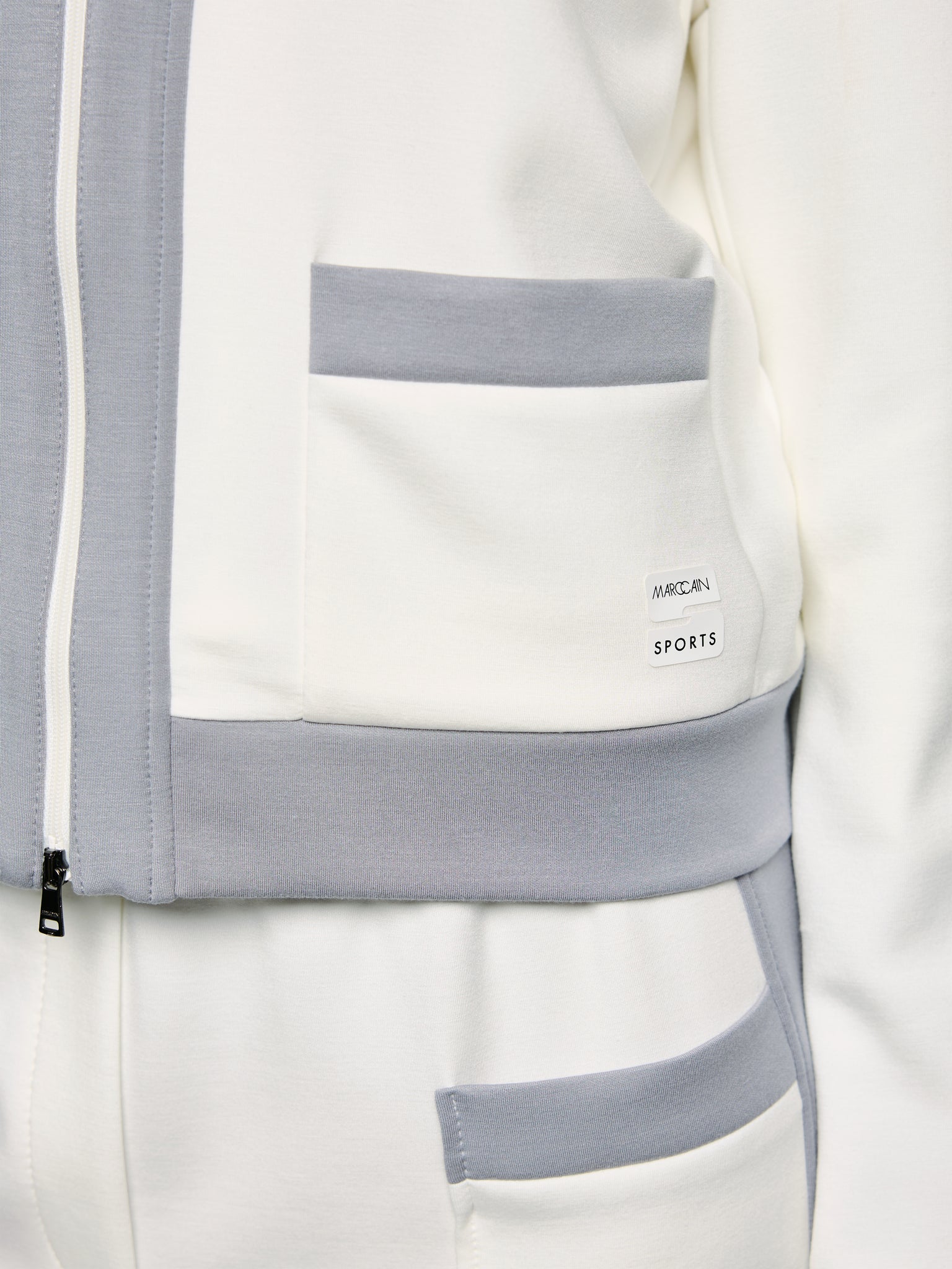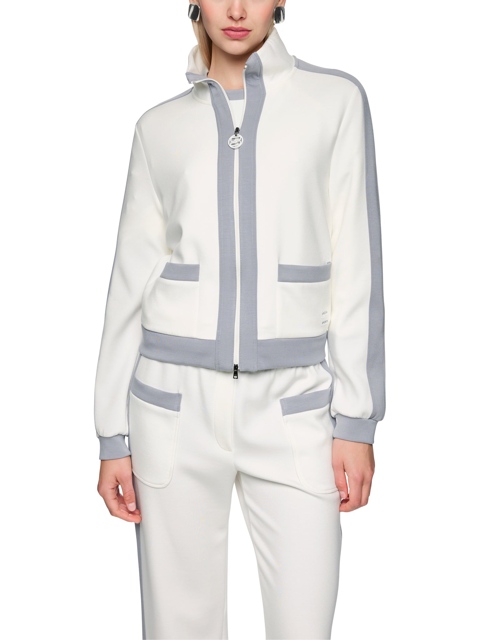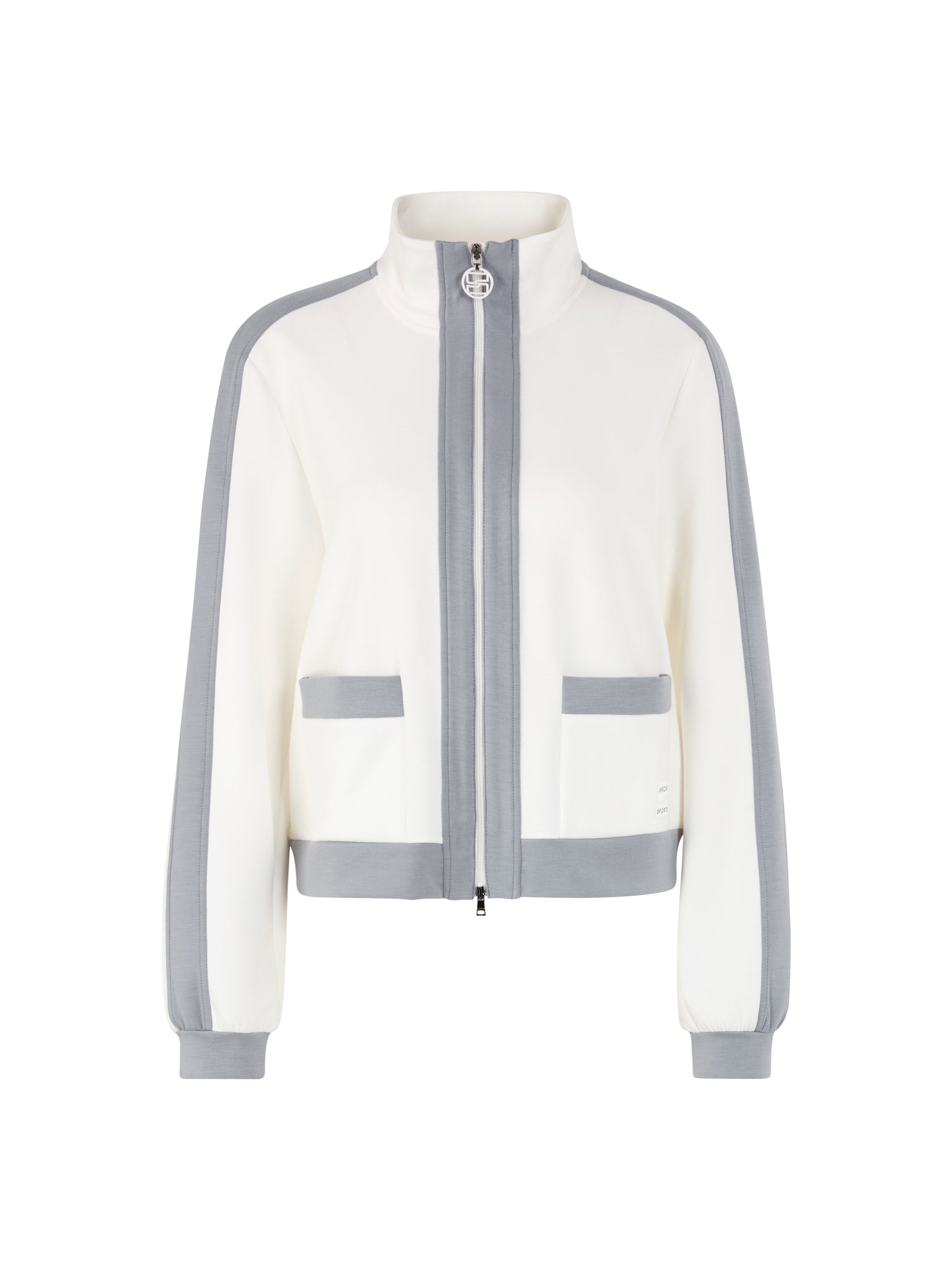 This jacket impresses with its classic design and straight cut. The soft jersey material feels pleasant against the skin and is very comfortable to wear. Special details include the cuffs, stand-up collar and side pockets. The jacket fastens with a zip featuring the Marc Cain Sports logo. This jacket is unlined.