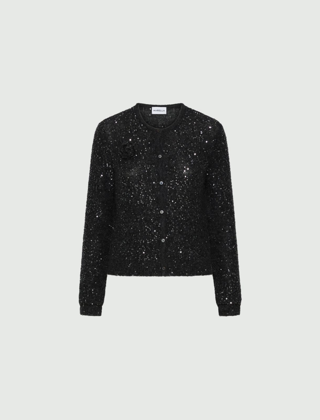 Sparkling sequins bestow a hint of glamour to this alpaca-blend cardigan. The various materials and feminine fit pair perfectly with jeans or tailored trousers. Complete the look with the flower brooch which can be worn as you please!