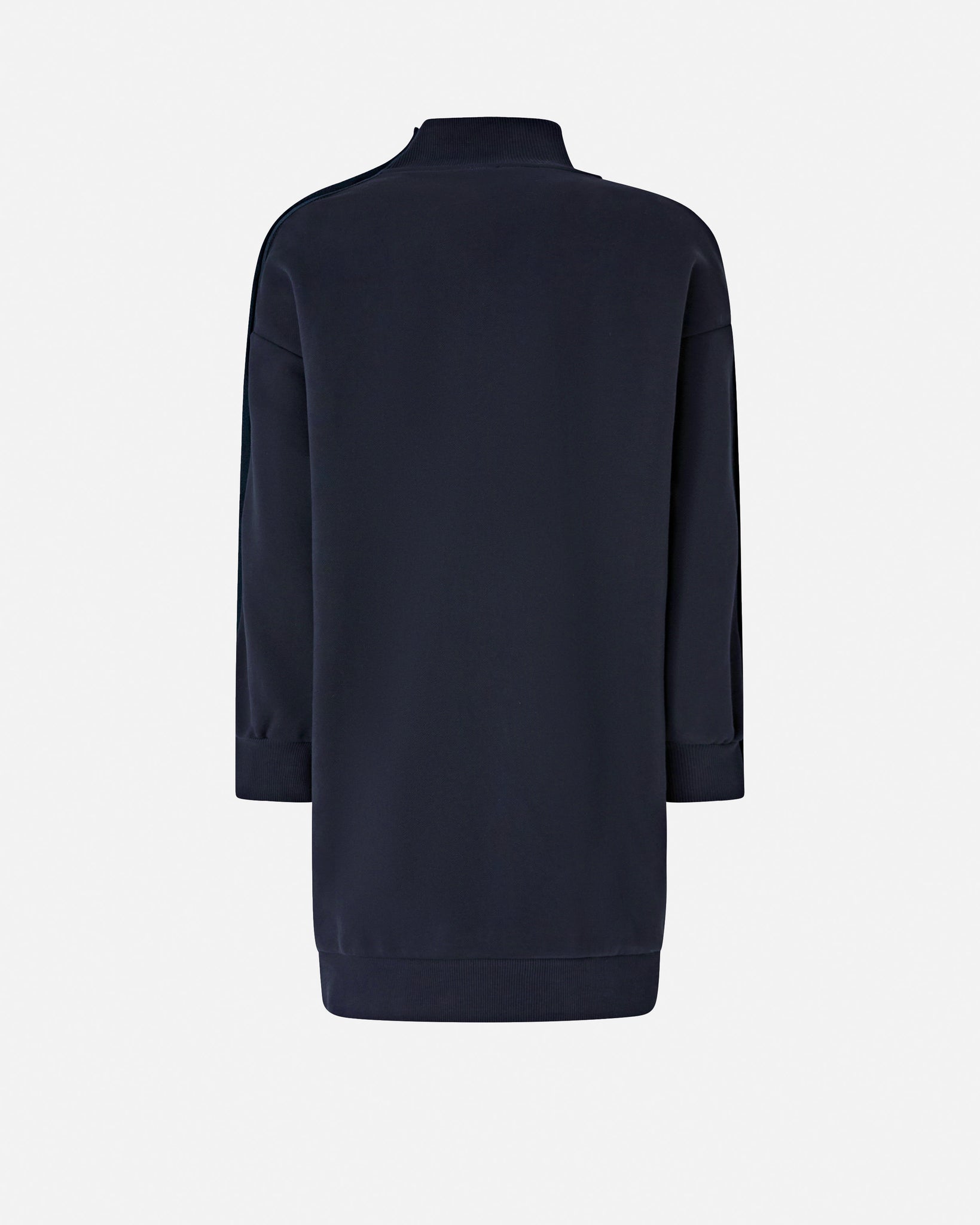 Long-sleeved maxi-sweater, which can also be worn as a short dress, made from pure cotton fleece. The garment is particularly comfortable, thanks to its loose fit and comfortable details, such as the rib-knit high neck, cuffs and hem. However, the style has not sacrificed a touch of personality in pure PINKO style, provided by the patch with the Love Birds logo embroidered on the front left side and the metal buttons decorated with stars that outline the sleeves and the side opening of the neck.