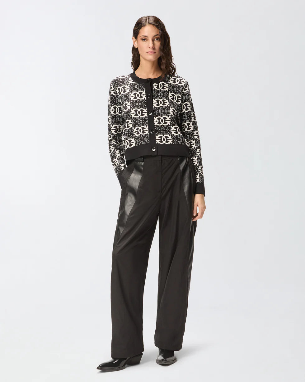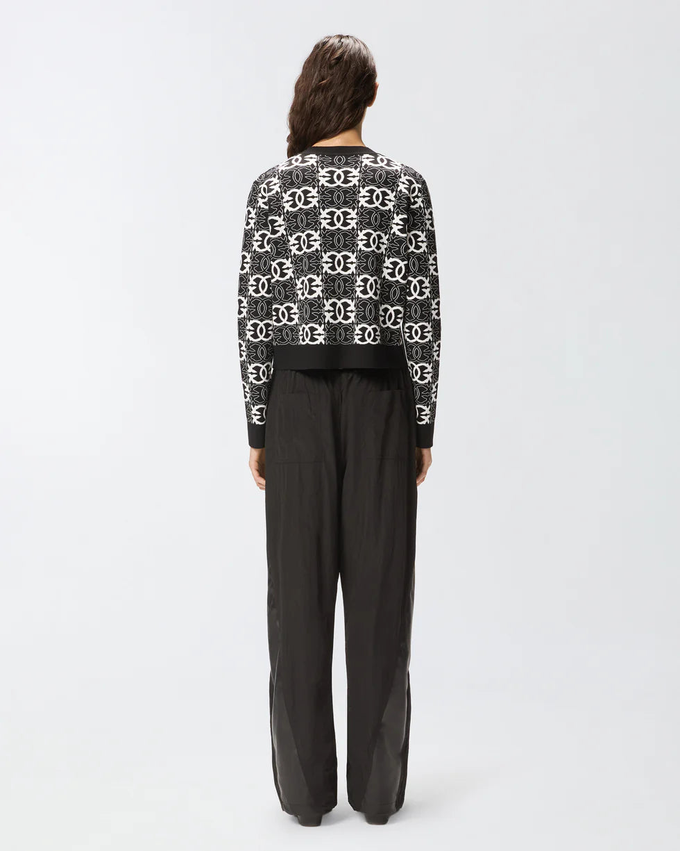 Crew-neck, long-sleeved knit cardigan with tone-on-tone buttons and contrasting neck, placket and cuffs. The all-over jacquard Love Birds logo motif is an eye-catching detail that enhances the model. Pair this refined, versatile piece with its matching skirt from the same collection for a sure-fire look.