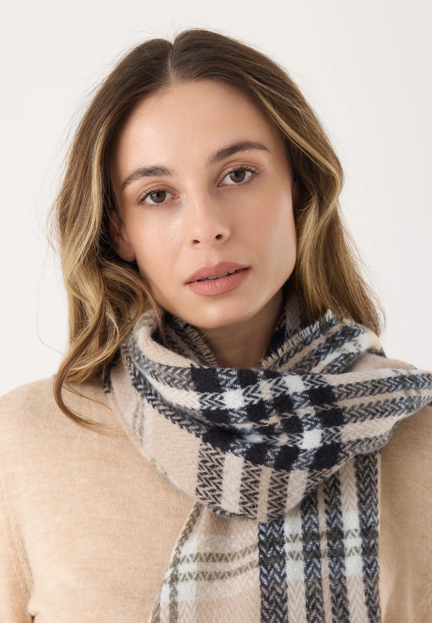This woven beige scarf combines a classic check pattern with modern statement embroidery. The soft surface ensures comfortable wear, while the striking lettering adds a unique touch to the design.
