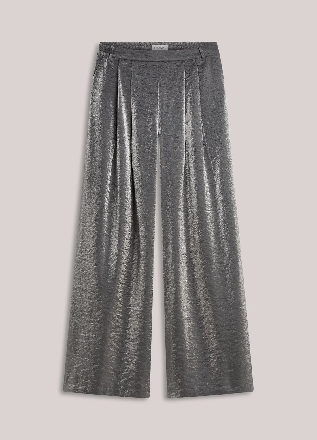 Trousers in a rich viscose blend with a metallic look and subtle crush effect. The trousers have ultra-wide legs with double pleats, side slit pockets and strip pockets at the back. Party time?