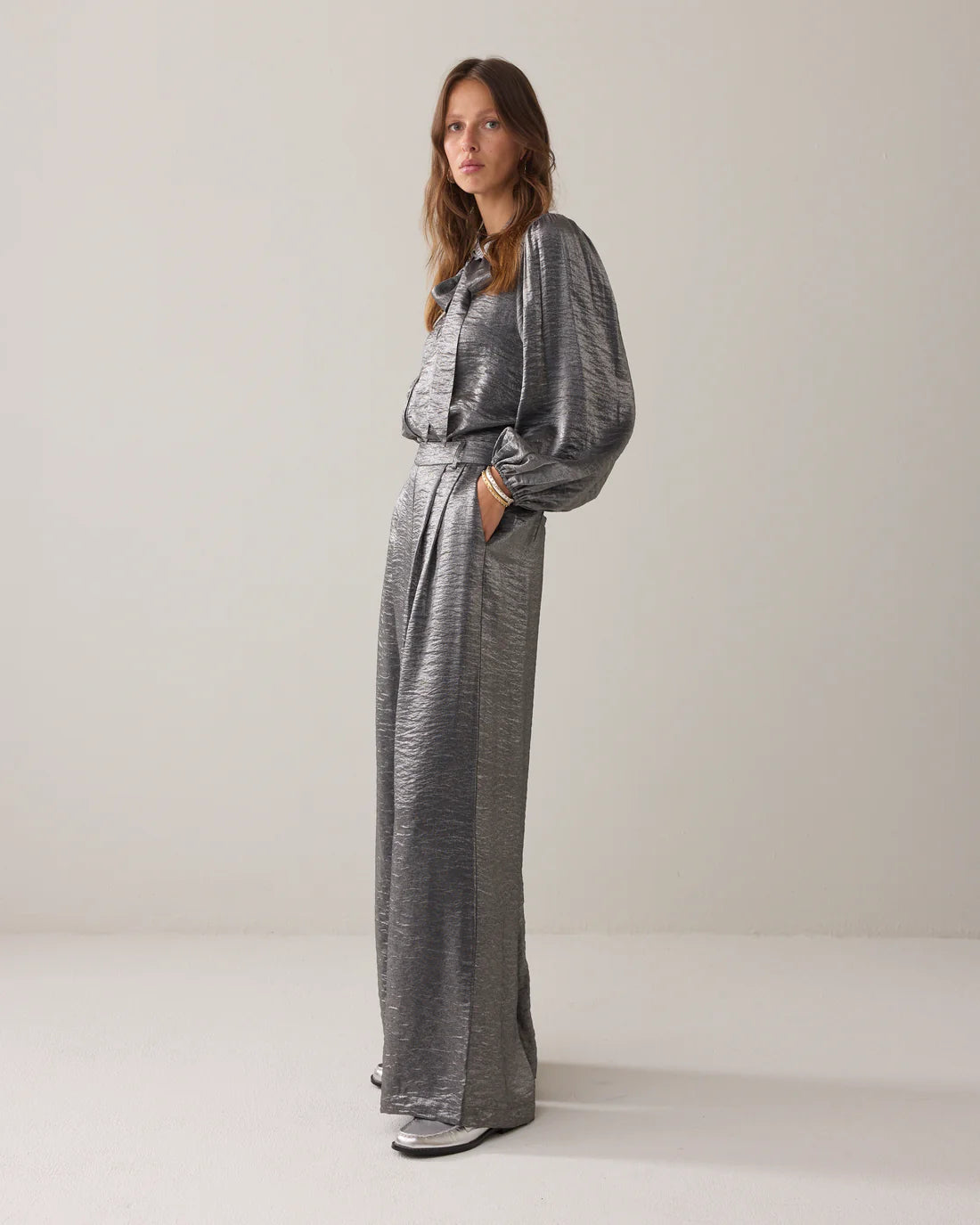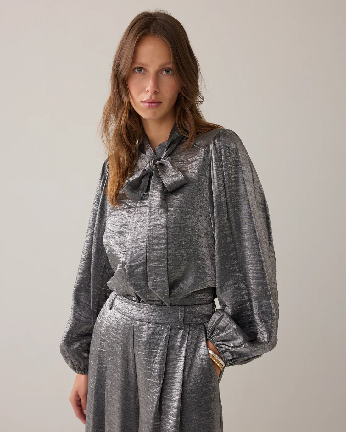 Festive blouse in a rich viscose blend with a metallic look and subtle crush effect. The blouse has diamond buttons and can be worn with or without a bow. The neckline has a stand-up collar and the long puff sleeves have elasticated cuffs. Go for a complete festive suit with the matching trousers: 4s2901.