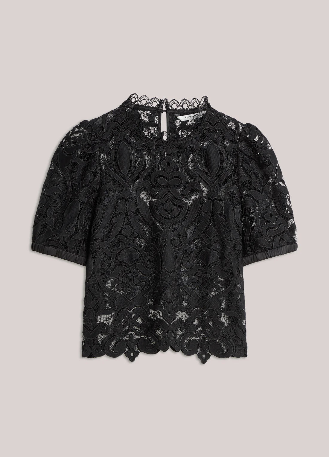 Boxy lace top with short puff sleeves and satin trim at the cuffs. The neckline and bottom are finished with a lace scalloped edge. The blouse has a slit with a button fastening at the neck.