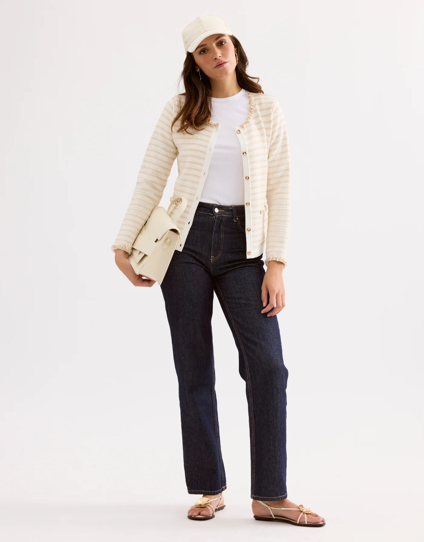 The ecru MELISSA cardigan charms with its refined elegance and precious finishes. Made from a textured knit with fine stripes, it is enhanced by delicate jewel-like details at the neckline, pockets, and button placket. Its golden buttons add a chic and radiant touch, perfect for brightening everyday outfits.