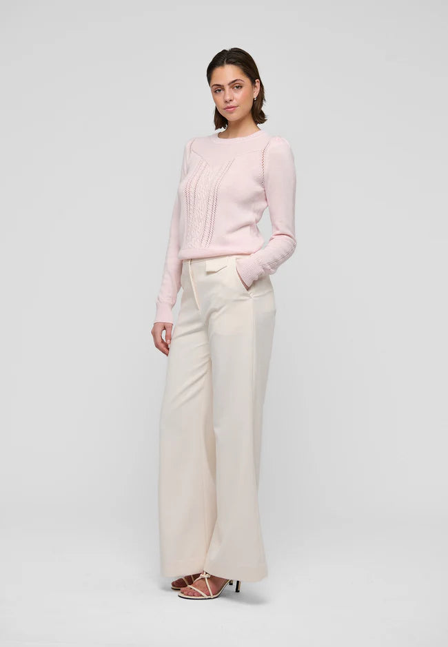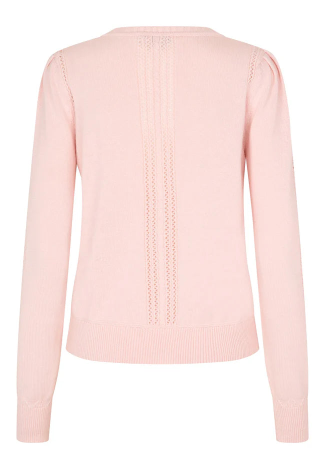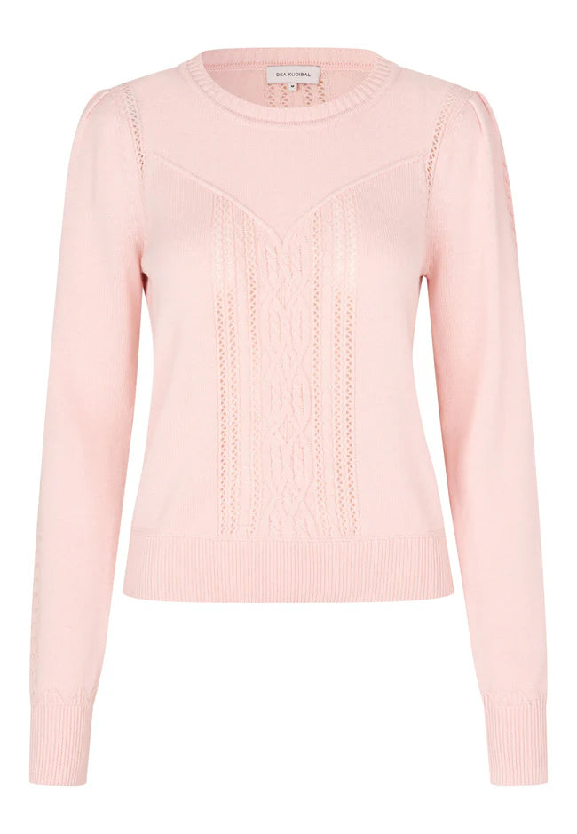 Dainty cabling and lace stitching run down the centre body and sleeves of this round neck sweater whilst a seam accentuates the bust line. Knitted in a cotton/wool blend in pale pink, the sweater has more lace knit and gathers around the shoulders.