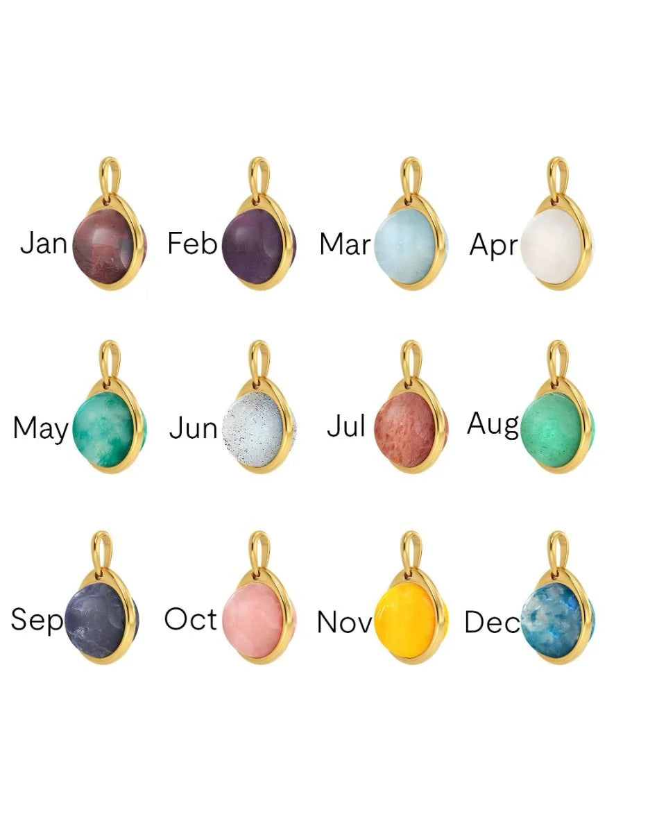 Charmentity Birthstones are a wonderful, personal pendant with a discreet setting that enhances your birthstone. All birthstones seen here are set in shiny 14K gold plating. The stones are: January Garnet (dark red), February Amethyst (purple), Mars Aquamarine (light blue), April Rock crystal (clear), May Emerald crystal (dark green), June Moonstone (milk white), July Quartz (red), August Peridot (green), September Sapphire (dark blue), October Rose Quartz (pink), November Jade (yellow) and December Blue phosphorite (dark turquoise). Natural stones always differ slightly in color, so please allow some differ based on the product photo.
