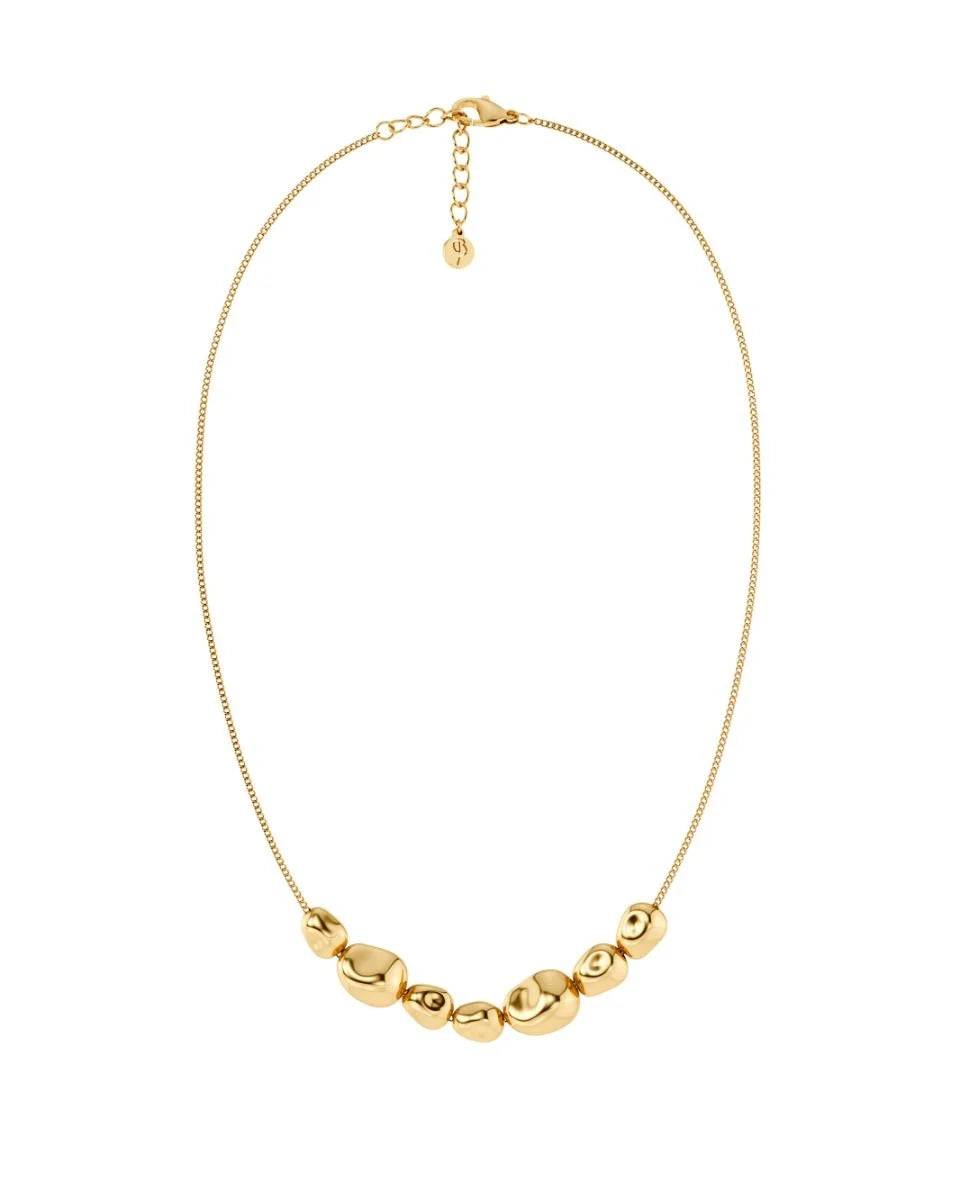 Leora is inspired by beach stones, gently shaped by the endless rhythm of the sea - a harmonious blend of natural contours and refined, minimalist elegance. Seen here in a bold multi-necklace in 14K gold plating, with a faceted curb chain that sweeps through six beautiful irregular-shaped stones in various sizes. Looks great when paired with any earrings from the same line.