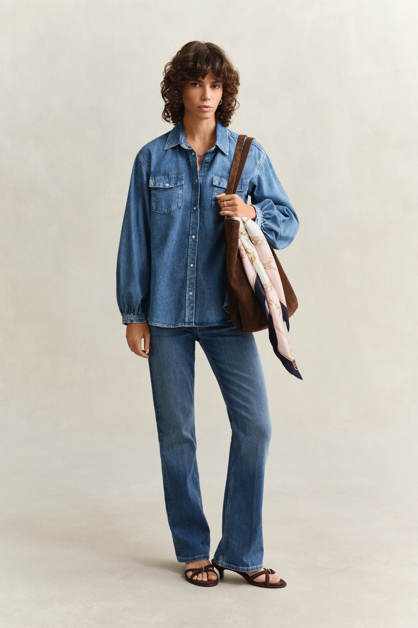 A modern addition to the wardrobe, this shirt features voluminous sleeves with dropped shoulders to enhance the silhouette. Crafted from denim in a mid-blue wash, it is designed with a relaxed fit, a point collar, snap button closure, and chest pockets finished with snap buttons. This shirt is designed for a relaxed fit, but if you prefer a closer fit, we suggest sizing down.