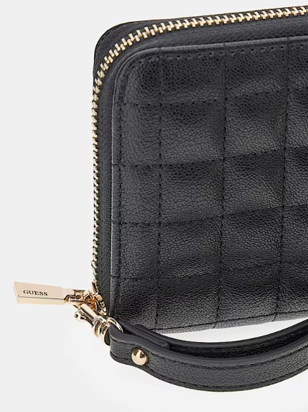 Main compartment with internal coin purse with zip.Credit card slots.Back zip pocket.Logo script on front with metal detailing.