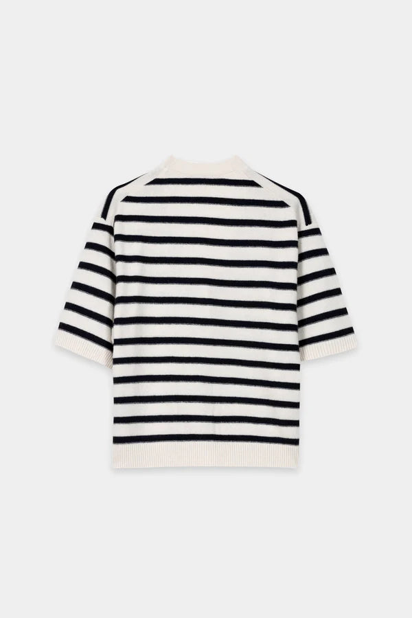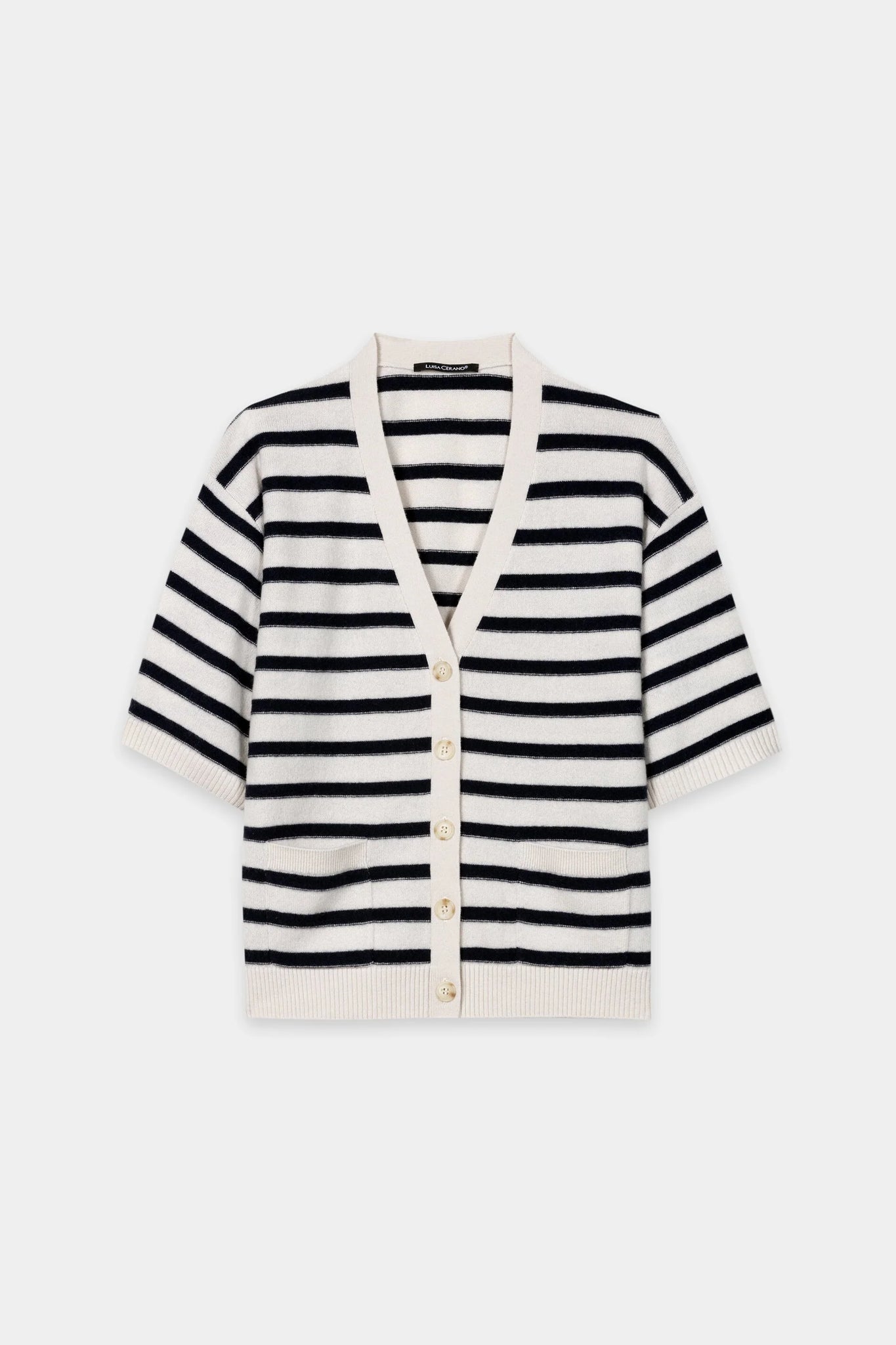 Short-sleeved, striped cardigan made from a fine cashmere blend with a V-neckline, French shoulder and full-length button placket. There are two small pockets on the front.