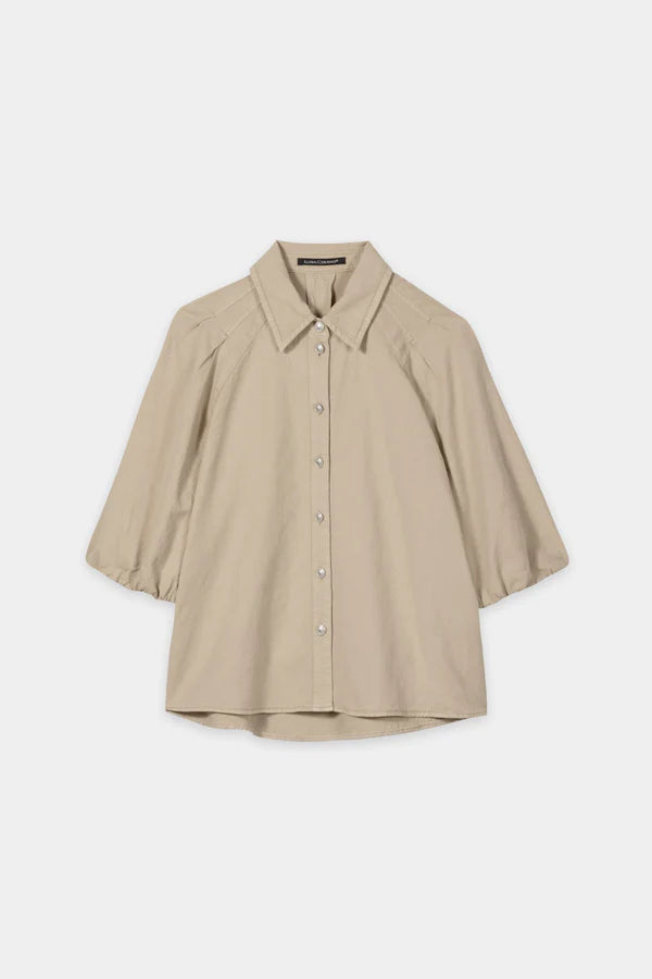 Blouse made of a summery cotton-linen blend in high-quality RFD fabric with decorative metal buttons and pleat details. The short, voluminous sleeves have elasticated cuffs.