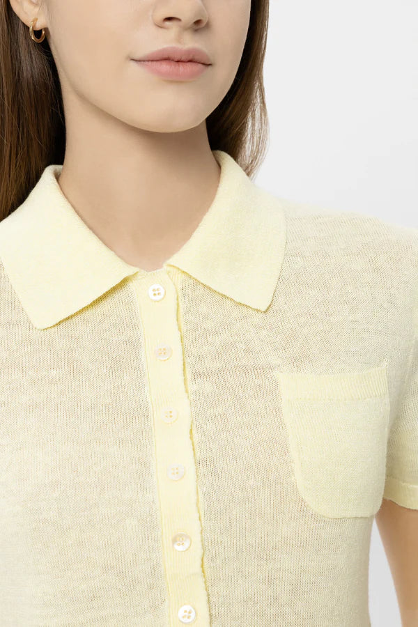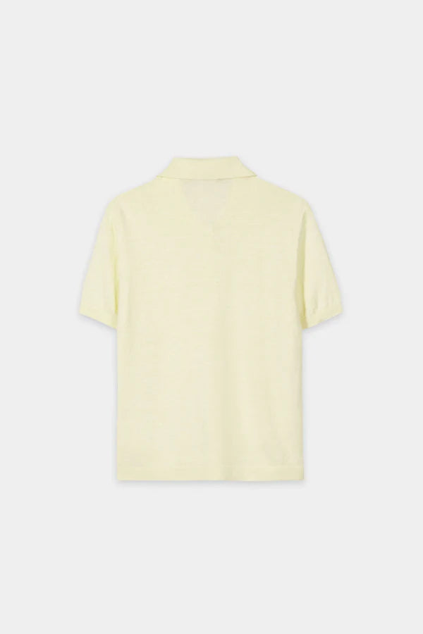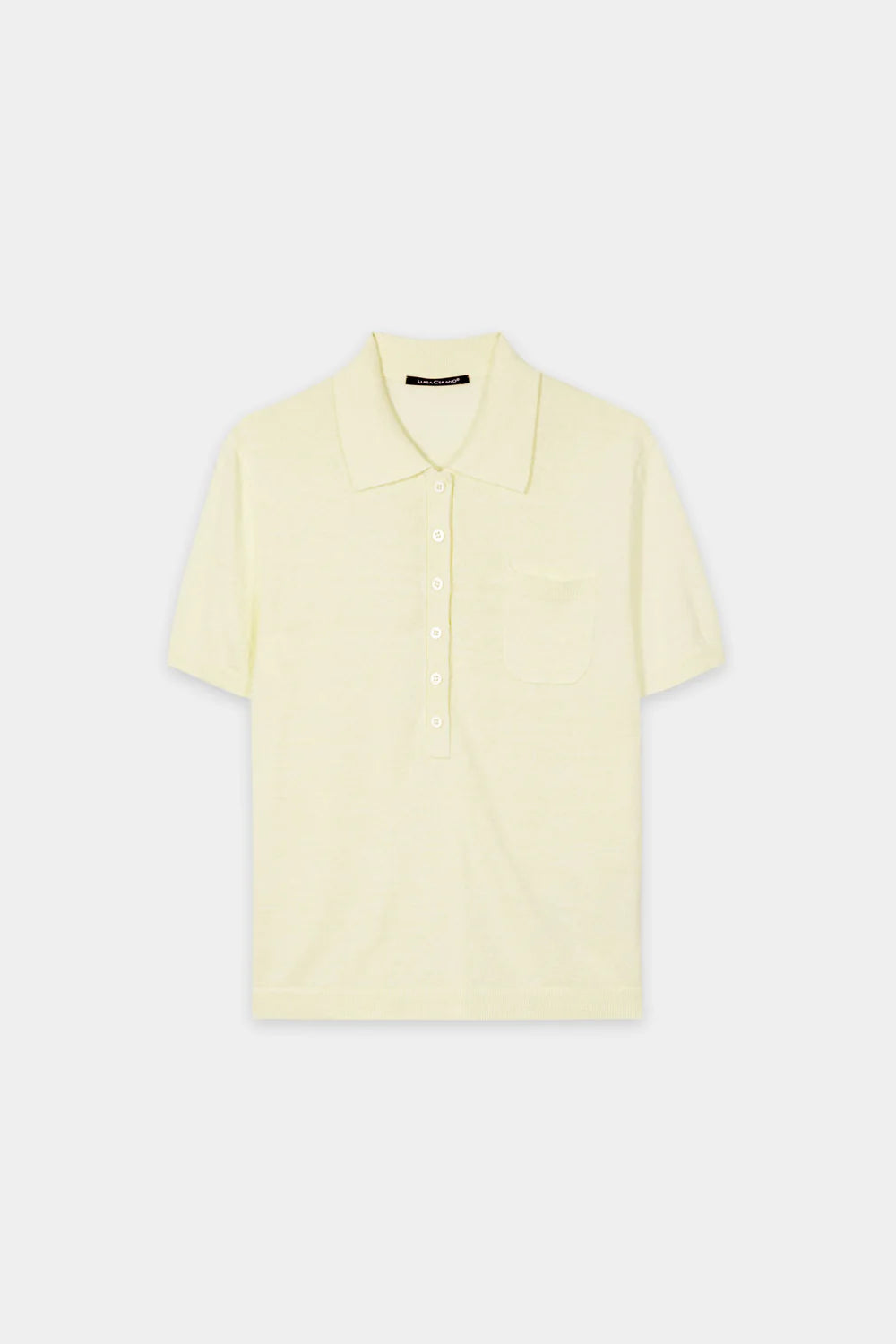 Polo shirt made from finely knitted Italian linen yarn with a cool summery feel and a slight sheen. Features include a polo collar with a half-length button placket and a patch breast pocket.