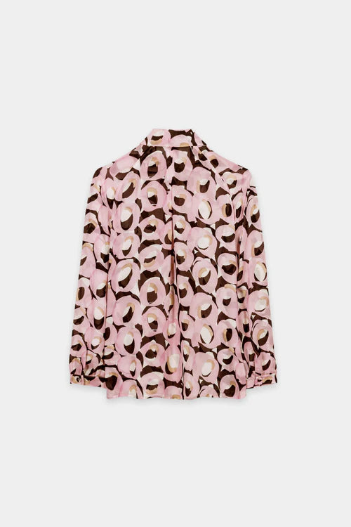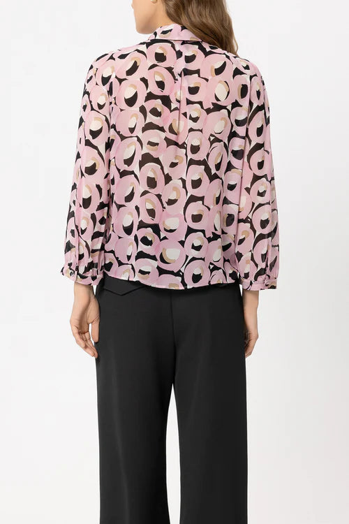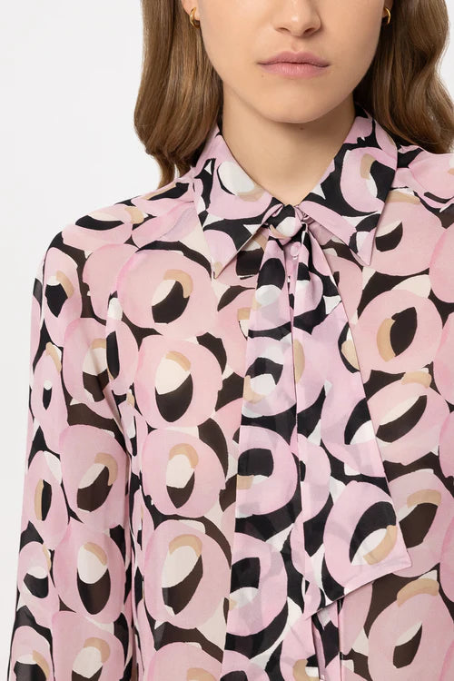 Semi-transparent shirt blouse made of flowing viscose crêpe with an exclusive retro print, flap detail and balloon sleeves. The buttons on the cuffs and button placket are covered with fabric.