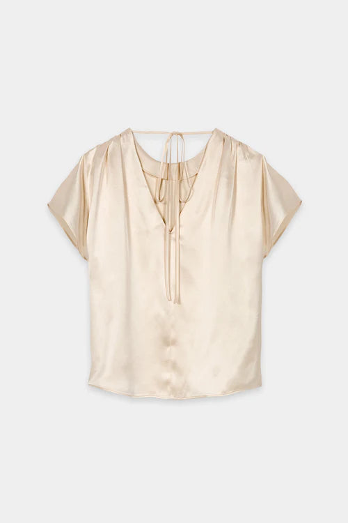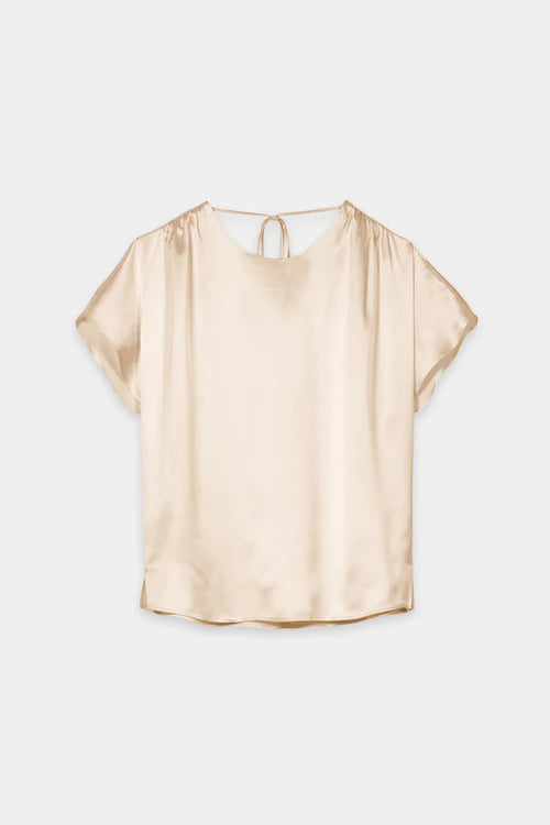 Boxy cut blouse made of flowing silk in an elegant satin weave with a round neckline, gathered shoulders and short cap sleeves. The back has a sophisticated design with a deep V-neckline and tie ribbon.
