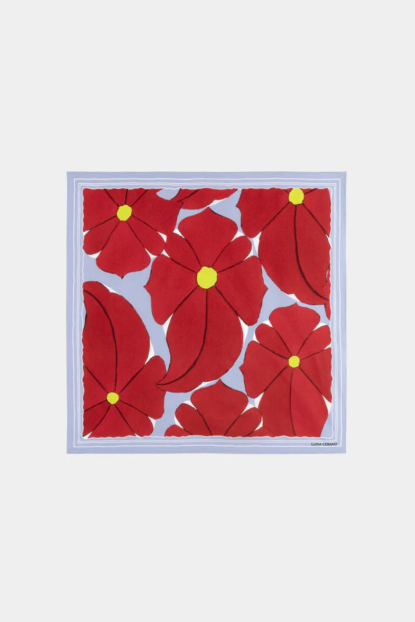 Rectangular scarf made from pure silk with a matt sheen and a large floral print. The brand lettering is discreetly woven into the outer edge.
