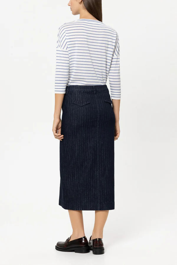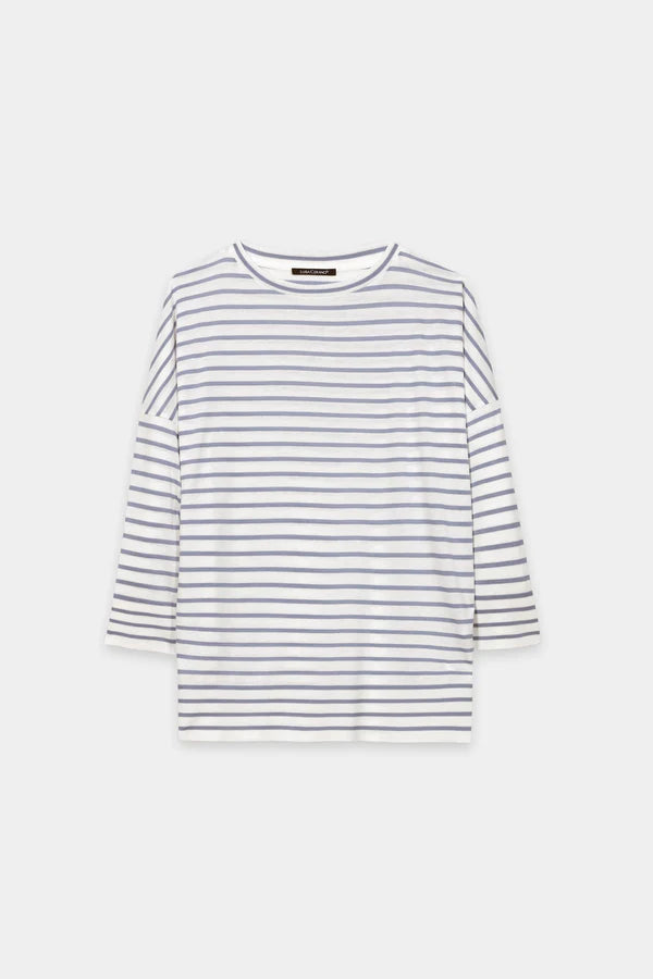 Striped cotton blend shirt with a bateau neckline, soft neck tape and subtle logo embroidery. The hem and three-quarter sleeves are finished with a ribbed cuff.