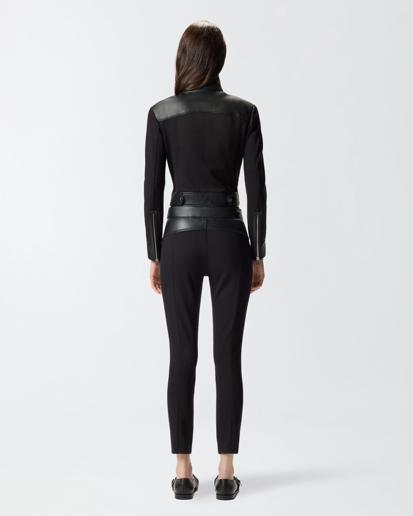 Dual-fabric biker jacket, distinguished by the combination of soft leather and neoprene for a comfortable end result that goes well with the fitted line and fully expresses PINKO’s DNA. The design is completed by a high collar, long sleeves with zip on the cuffs and buttoned straps on the rear hem. Two-way metal zip fastening on the front.