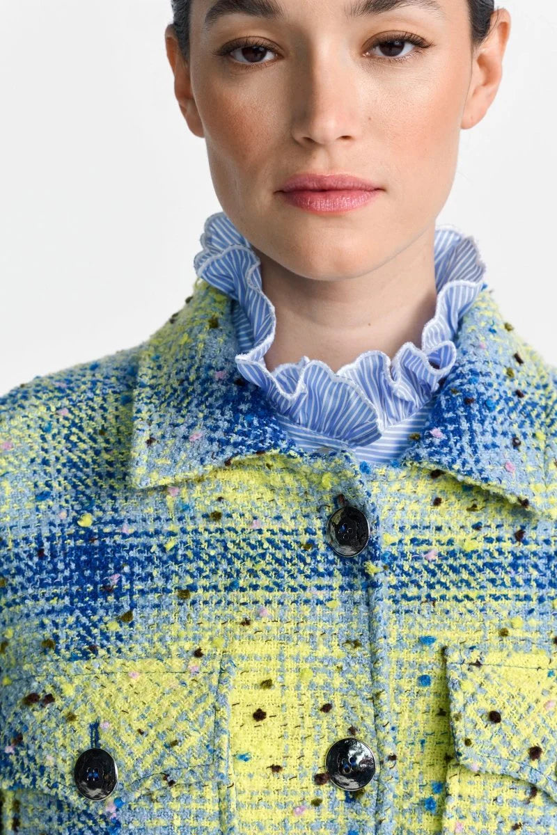 This casual bouclé shirt jacket with a yellow and blue plaid pattern will add a splash of color to your wardrobe. The shirt collar, round silver buttons, and patch pockets give this must-have piece a modern retro flair.