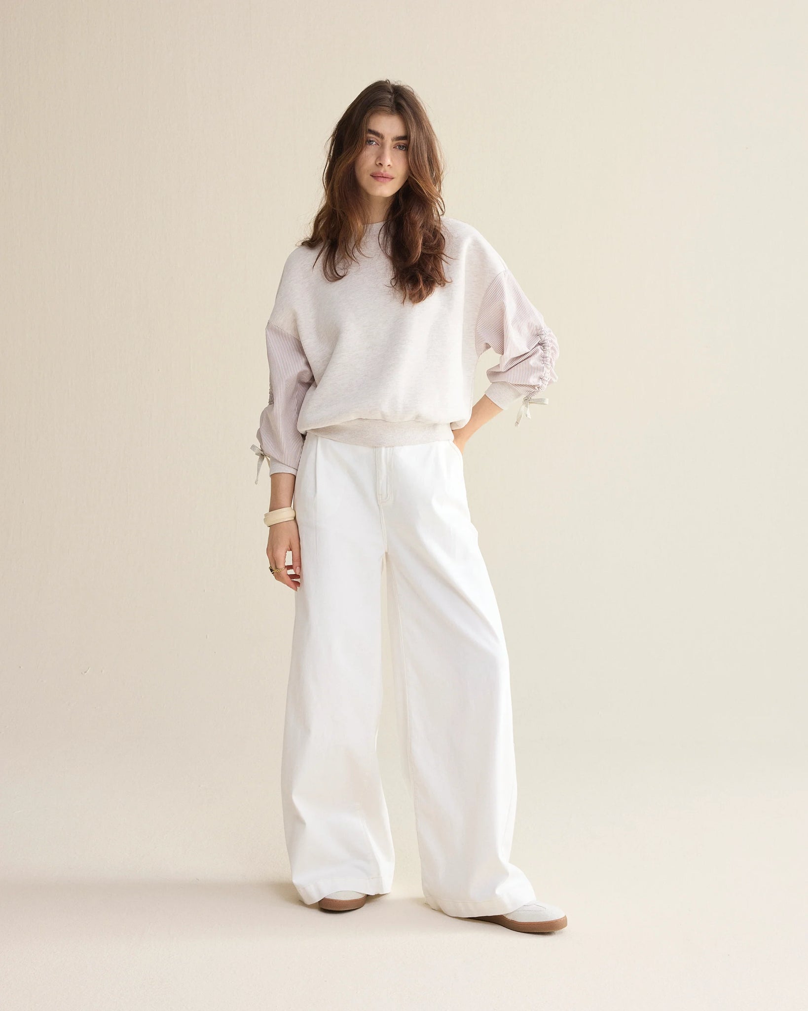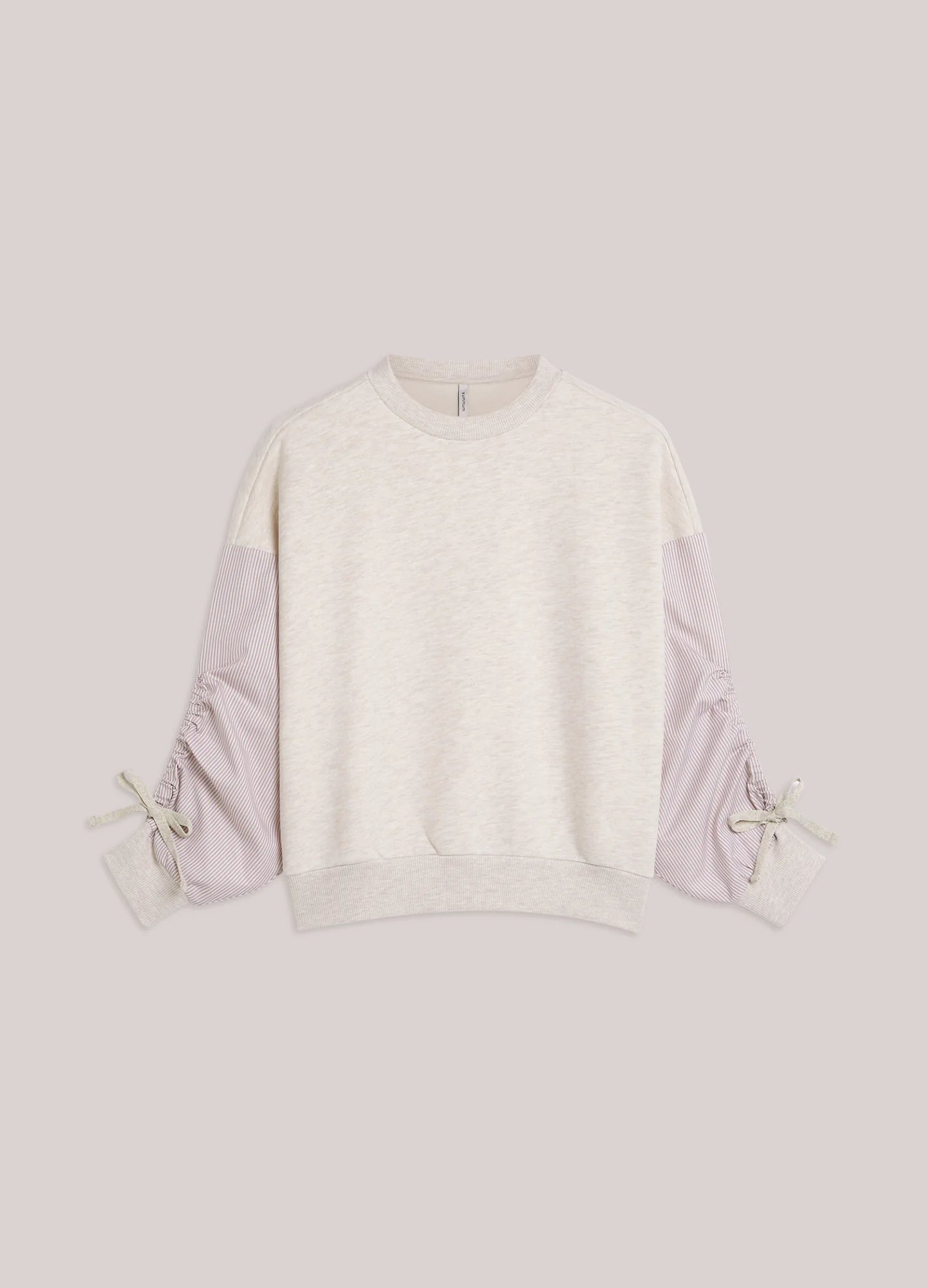 Sweatshirt in a soft melange fabric with a brushed interior and a relaxed, loose fit. The jumper has sleeves in striped poplin cotton, which can be rolled up long or three-quarters with bows.